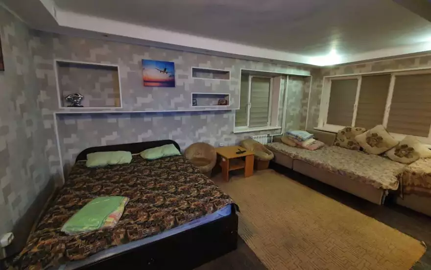 В квартире находится двуспальная кровать, евро-диван, евро-уголок, ТВ кабельное, интернет, стиральная машинка автомат, посуда, белье.