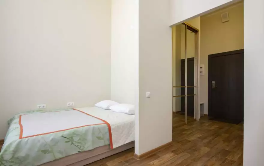 В главной комнате располагается двуспальная кровать, диван-кровать, кухонный гарнитур полностью оборудованный для приготовления еды, обеденная зона для двух человек. В ванной комнате находится душевая кабинка и стиральная машина. В прихожей расположен большой шкаф в который точно войдёт весь багаж и стенка для верхней одежды.
