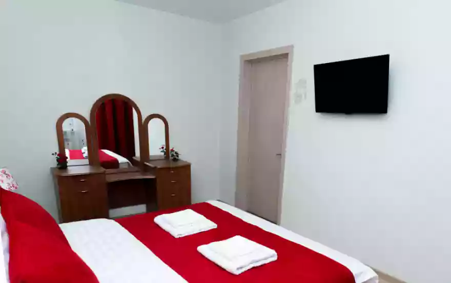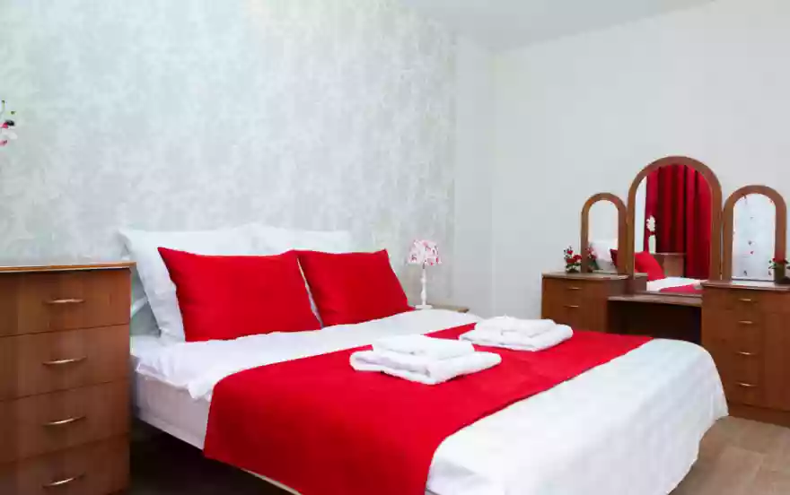 - В нашей новой двухкомнатной квартире выполнен свежий, современный евроремонт из качественных материалов. Преимущества квартиры в том, что комнаты в ней раздельные, в каждой комнате ЖК-телевизор. Яркий интерьер спальни располагает к приятному отдыху. Большая двуспальная кровать с ортопедическим матрасом позволяет полноценно выспаться. Для хранения вещей в спальне есть комод, прикроватная тумба. Для личного ухода предназначен трельяж.