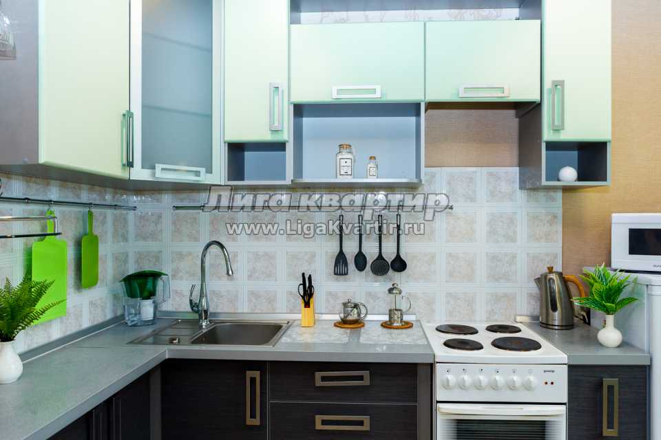 - Просторная укомплектованная кухня позволит полноценно по-домашнему приготовить и насладиться трапезой и чаепитием в кругу семьи или друзей. Здесь есть вся необходимая техника и современная красивая посуда.