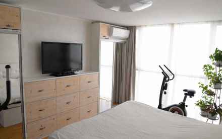 В стоимость квартиры входит мебель (спальные гарнитуры в комнатах, встроенный шкаф в холле, встроенный кухонный гарнитур со встроенной бытовой техникой) Холодильник, варочная панель, духовой шкаф – Hotpoint Ariston, современная вытяжка. Два кондиционера (на кухне и в спальне).