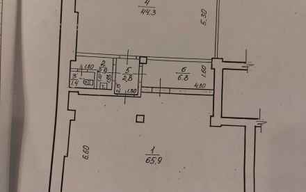 Торговый зал 65.9 квадратных метров, склад 44.3 квадратных метров, кабинет 6.8 квадратных метров.