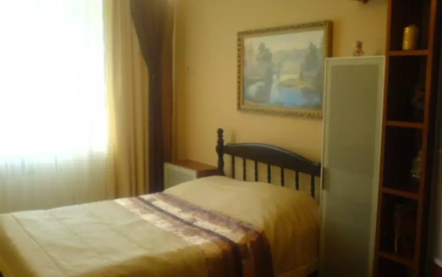 - Основное пространство занимает просторная гостиная, где находится большая двуспальная кровать, шкаф купе, телевизор с кабельными каналами. Две тумбочки расположены по краям кровати, что очень удобно.