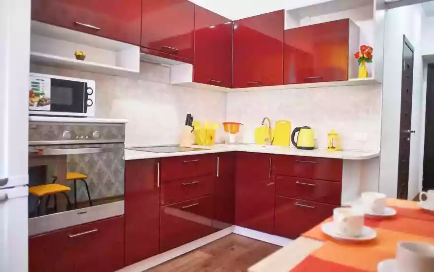 - Просторная кухня оборудована всей необходимой для проживания мебелью и техникой. Яркие интерьерные детали добавляют уюта и домашнего комфорта в обстановку. Есть полный комплект посуды на 4 персоны.