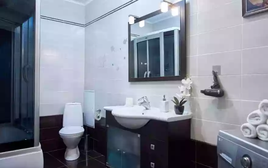 - Чистейший санузел оборудован белоснежной сантехникой и душевой кабиной. В наличии все принадлежности для полноценного личного ухода гостей - от стиральной машины-автомат до фена и нужных мелочей.