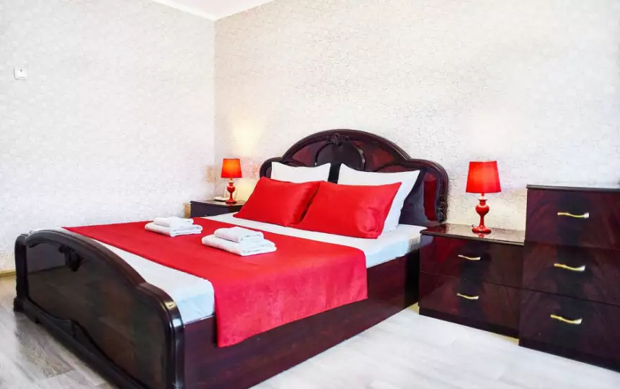 - Спальня оснащена дорогой деревянной мебелью в стиле “современный классицизм”. Красивая резная двуспальная кровать с ортопедическим матрасом, прикроватные тумбы, зеркальный трельяж создают все условия для полноценного отдыха как при краткосрочном, так и при длительном проживании. В спальне установлен ЖК-телевизор.