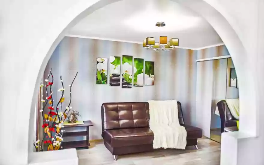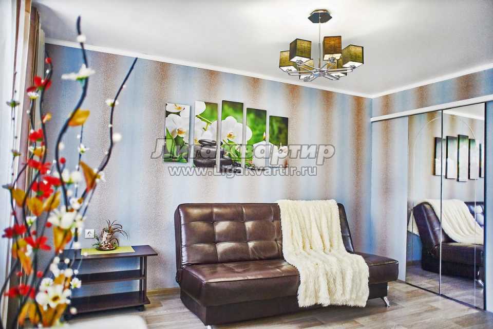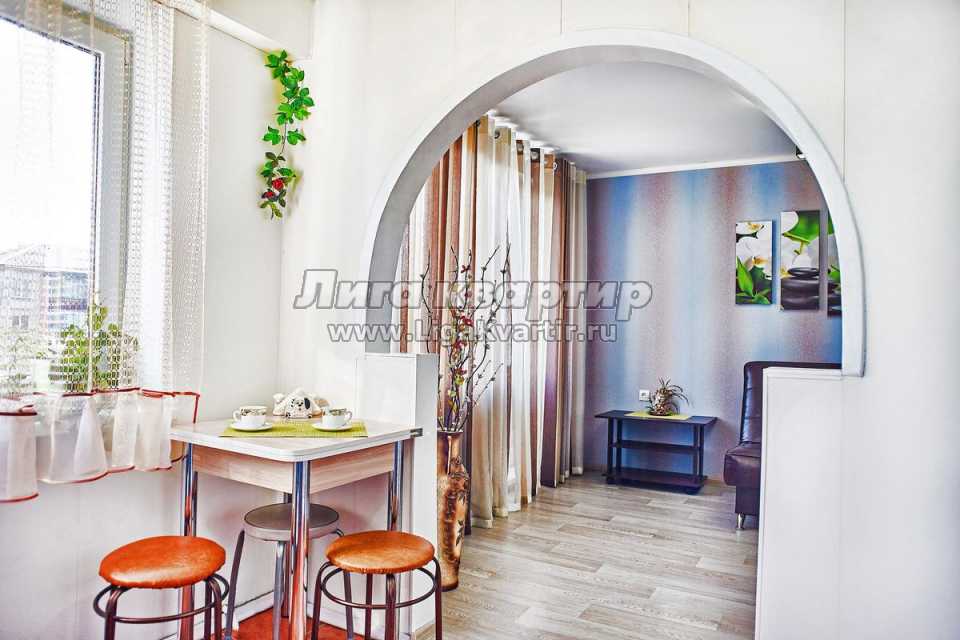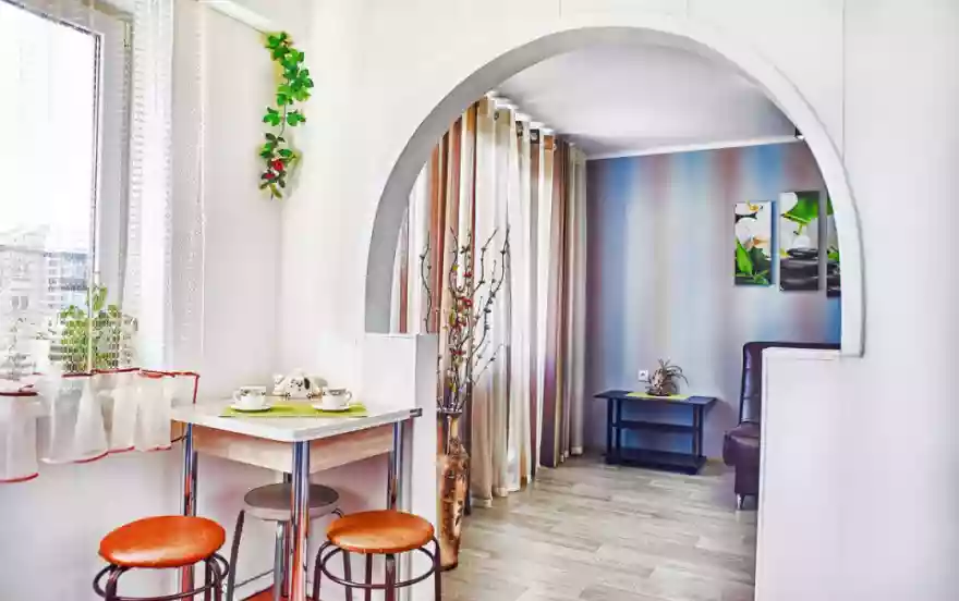- В квартире выполнен свежий качественный евроремонт. Двухкомнатная квартира рассчитана на размещение до 4-х гостей. Комнаты раздельные, гостиная-студия отделена от кухни дизайнерской аркой. Яркими элементами интерьера являются декоративный камин и стильная люстра. Роскошный кожаный диван раскладывается в полноценное удобное двуспальное место. Для хранения вещей служит вместительный шкаф-купе с зеркальными створками.