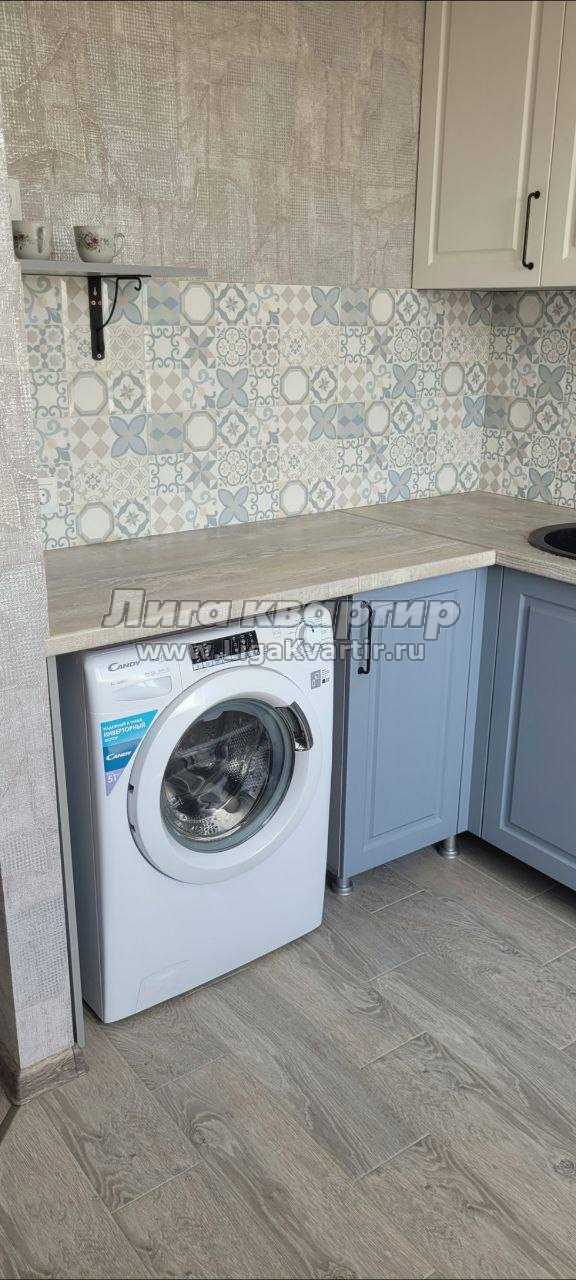 Частично меблирована: есть раскладной диван, шкаф для хранения вещей, тумбочка. Кухня компактная, всё необходимое для готовки. Из техники — стиральная машина и электрическая плита.