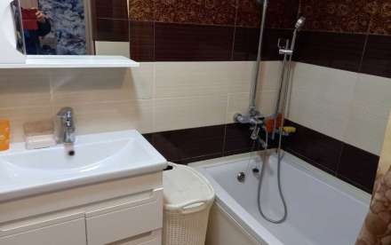 - В квартире: Мебель в комнатах / Холодильник / Кондиционер / Мебель на кухне / Интернет / Можно с детьми / Ванна / Телевизор