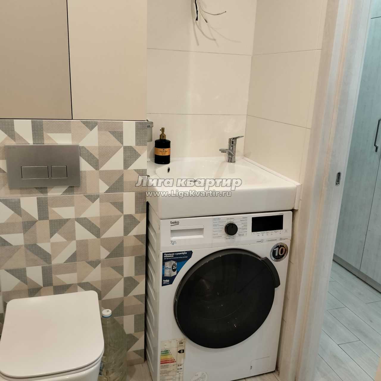 Двуспальная кровать, односпальный диван, кондиционер, пылесос, утюг, фен, гладильная доска, сушка для белья, стиральная машина с сушкой, мультиварка, посуда, чайник, всё необходимое для кухни, для ванной.