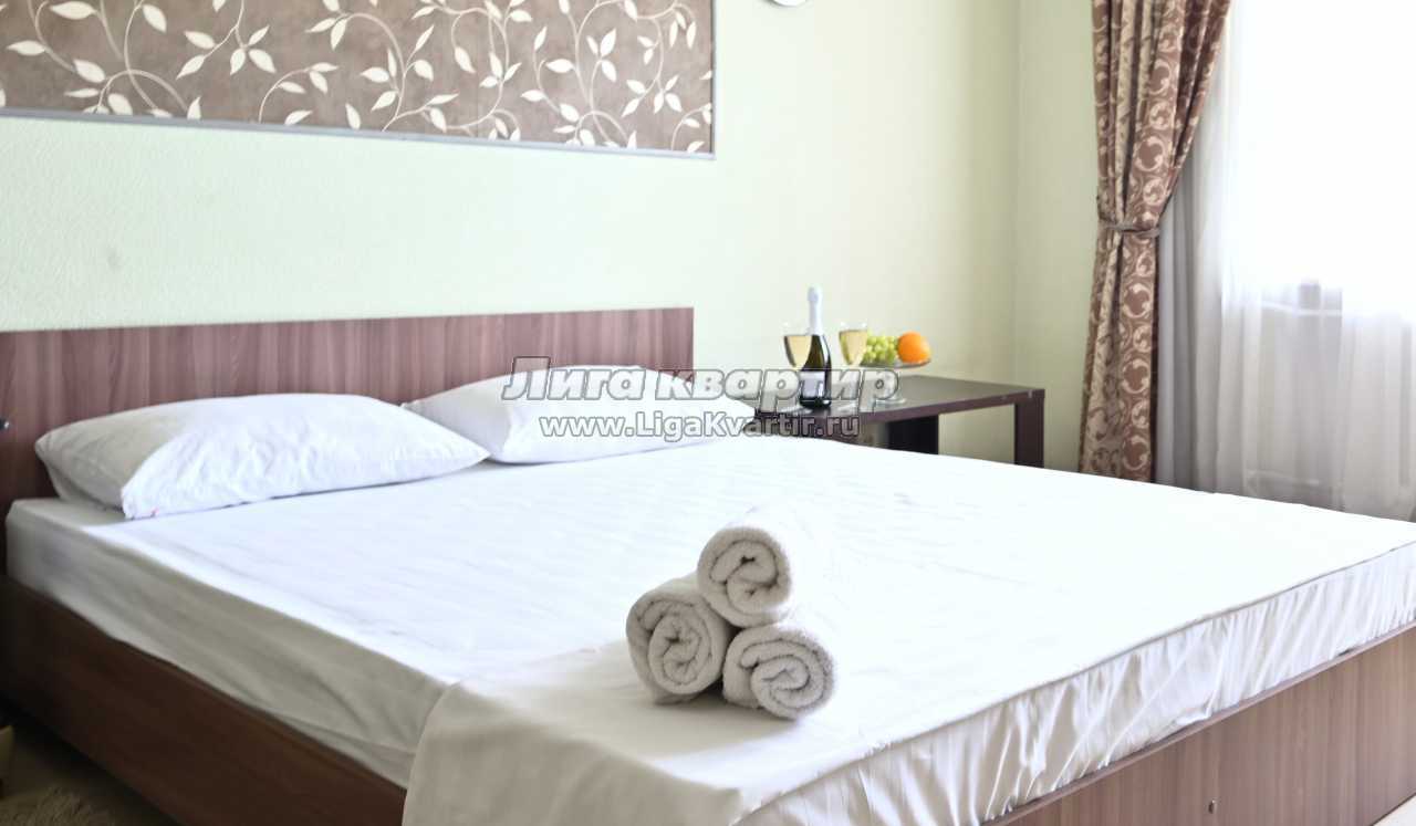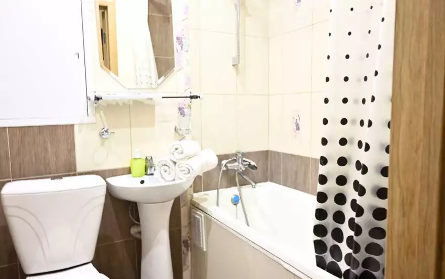 Изнутри комната выполнена в нежных тонах, что создает уютную и непринужденную обстановку. Большой кожаный диван расслабит тело и душу после продолжительного трудного дня. Натяжные потолки и оформленные со вкусом стены приятно успокаивают своей цветовой гаммой в однокомнатной квартире на сутки. Для ваших вещей в комнате предусмотрен огромный шкаф-купе, который выигрышно вписан в общий интерьер. Современная конструкция дивана позволяет с легкостью превратить его в двуспальную кровать. В дополнение к этому на стене висит большая плазма, вещающая спутниковое телевидение. Из вещей, создающий дополнительный комфорт есть фен и утюг, полотенца и ароматное постельное белье, повседневные гигиенические средства, современная стиральная машина и беспроводная сеть Интернет. Прогрессивный стиль кухни, выполненный в белых тонах, дарит ощущение чистоты и опрятности. Кухня оборудована вместительным холодильником, плитой, чайником, микроволновой печью и всеми необходимыми столовыми приборами. В таком шикарном кухонном помещении вы сможете приготовить все: от изысканных десертов и пирогов, до запеченной куриной грудки под соусом Бешамель. Ванная комната оборудована по последнему слову техники и выполнена в таких же светлых тонах.