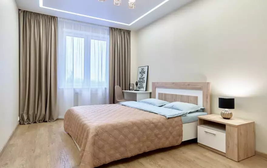Дизайнерский интерьер просторных ”Двухкомнатных апартаментов" выполнен в современном стиле. Апартаменты размещают до 4 гостей: двуспальная кровать с ортопедическими матрасами и удобный раскладной диван, превращающийся в еще одно спальное место для двоих. Всё постельное белье самого высокого качества.