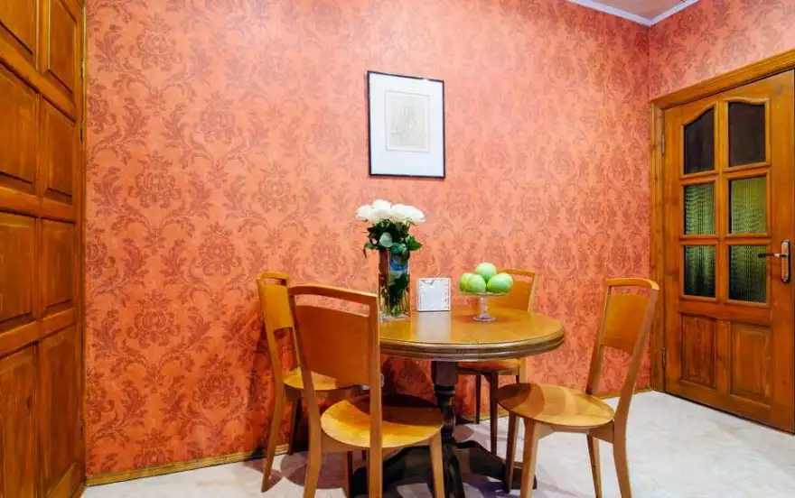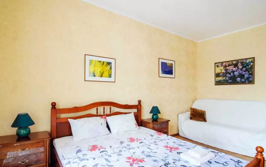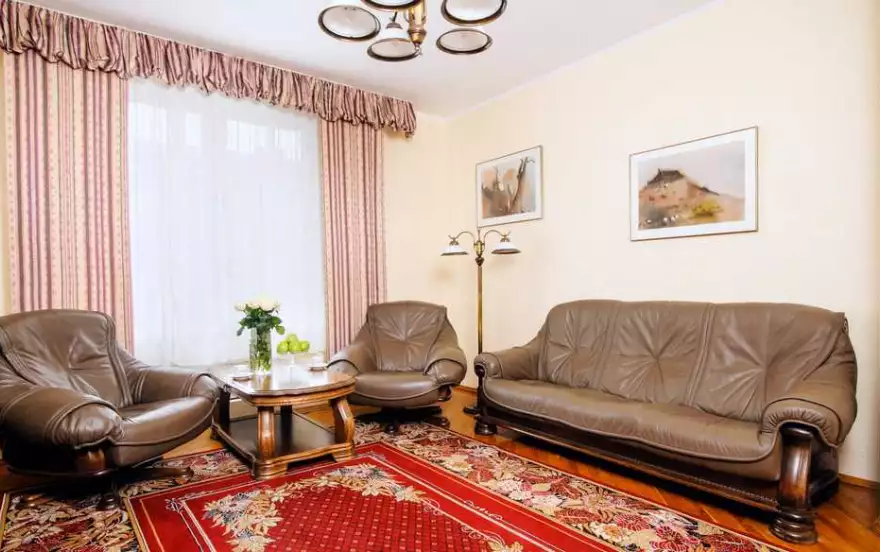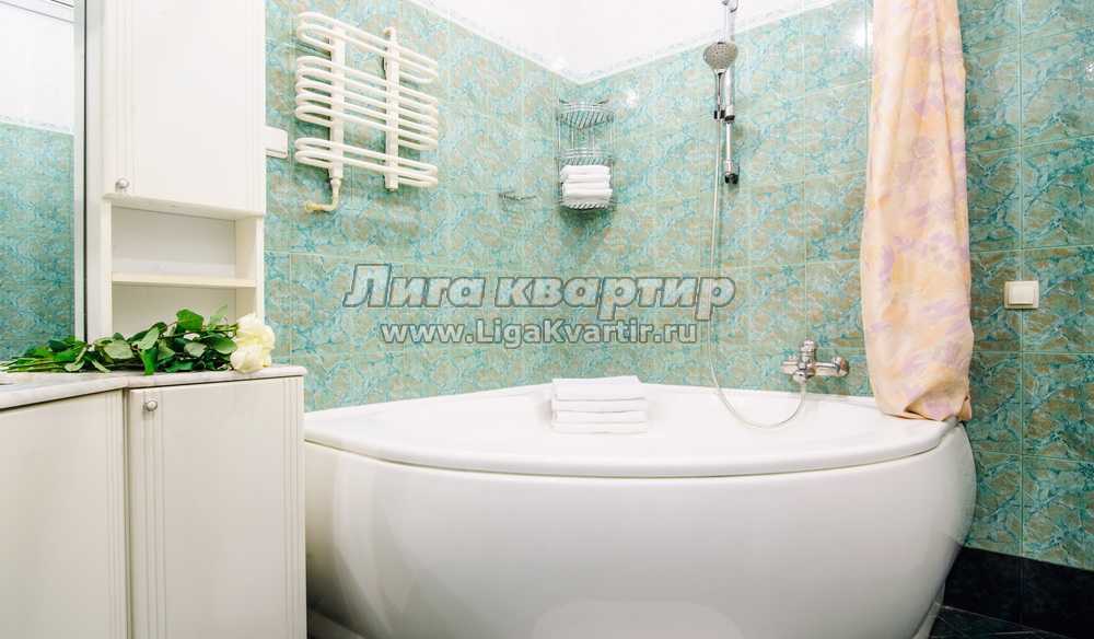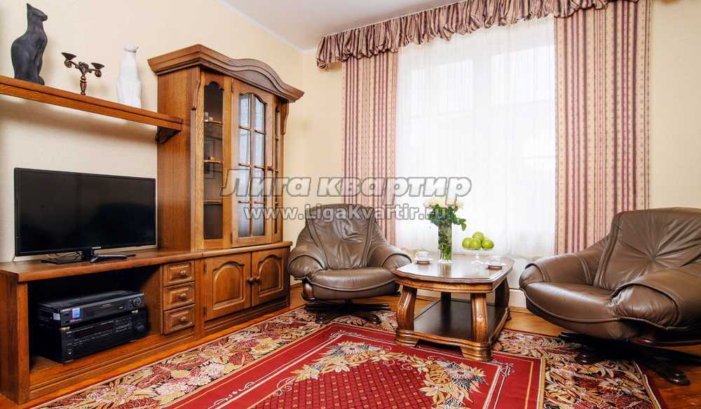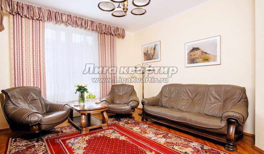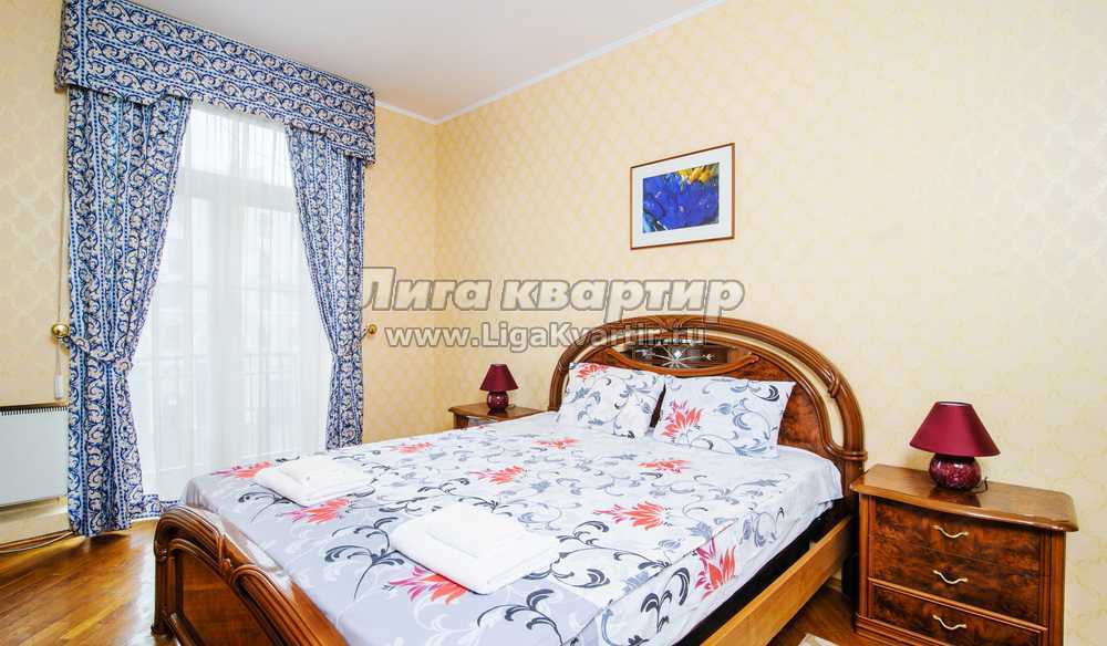Отличающаяся строгим интерьером квартира непременно придется по вкусу все тем, кто ценит образцовую классику. Благодаря мягким тонам гостиной пребывание в ней будет чрезвычайно уютным. А присутствие роскошного кожаного дивана в квартире на сутки и настоящей деревянной мебели позволит жильцам наслаждаться спокойствием и умиротворенностью. Массивность дубовой кухонной мебели создаст атмосферу защищенности и позволит расслабиться после напряженного дня. С первого взгляда внимание сосредотачивается на оригинальной варочной поверхности. Расположенная на кухне посуда и комплект бытовой техники удовлетворят запросы любой хозяйки. С холодильником, электрочайником и СВЧ-печью приготовление пищи станет чрезвычайно комфортным занятием. Создаваемая основной спальней изысканная атмосфера станет лучшей гарантией полноценного отдыха. Невероятные размеры установленного в ней зеркала визуально расширяют пространство. Если цветовую гамму первой спальни можно считать выдержанной, то вторая, наоборот, отличается свежестью и легкостью. Непременными атрибутами каждой спальни являются двуспальная кровать с ортопедическим матрасом и комплект свежего белья.