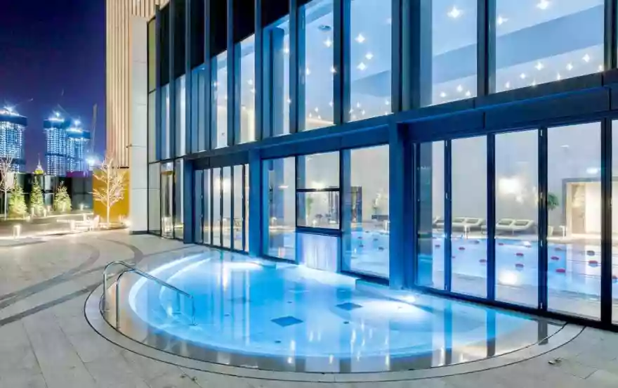 Также В ЖК есть фитнес клуб с панорамным бассейном и бар с кинотеатром, где вы можете арендовать приватный зал для просмотра фильма для двоих. Доставка еды и продуктов до двери.