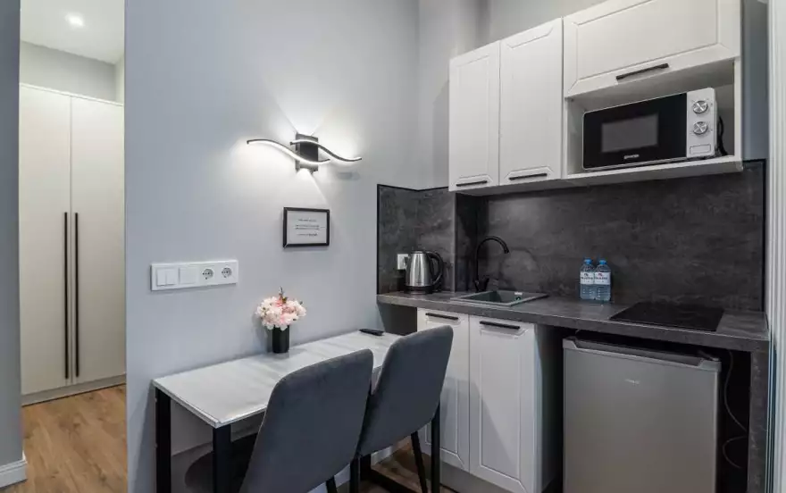 В студии создана уютная атмосфера для комфортного проживания до 2 гостей. В распоряжении гостей — удобная двуспальная кровать, кухонная зона с варочной панелью, микроволновкой, холодильником, чайником и набором посуды, обеденный стол и современный санузел с душевой кабиной и стиральной машиной.