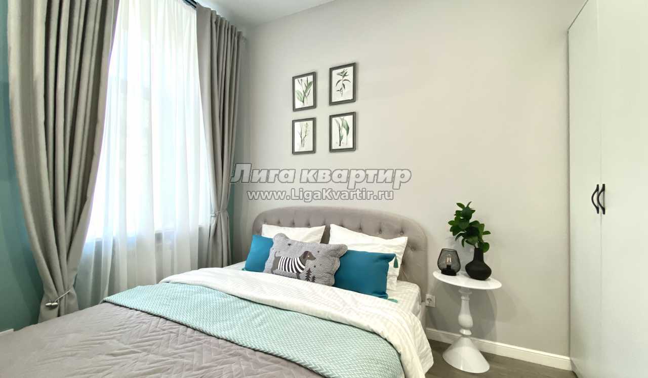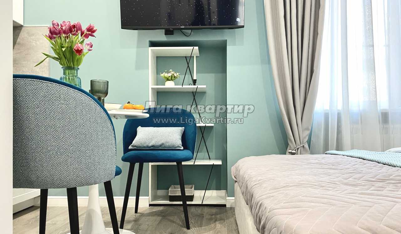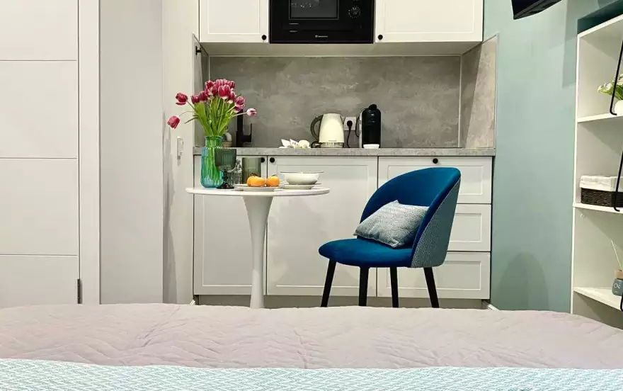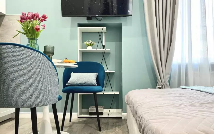 Квартира площадью 16 м² оформлена в современном дизайнерском стиле с продуманной планировкой. В спальной зоне — удобная двуспальная кровать с качественным матрасом, мягким текстилем и аккуратным декором. Интерьер выполнен в светлых оттенках с акцентами, создающими уютную и спокойную атмосферу.