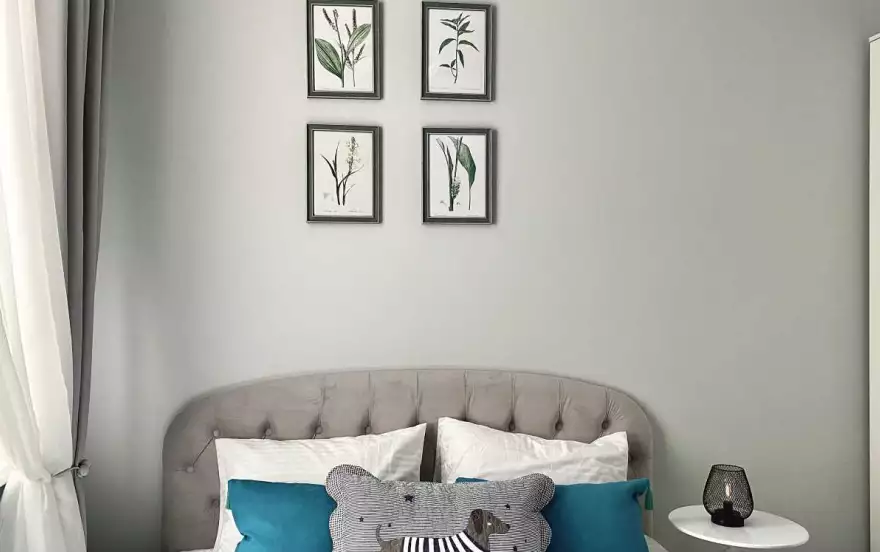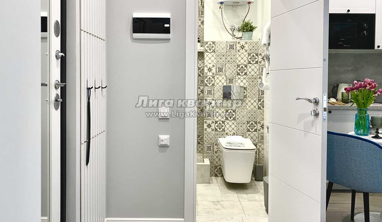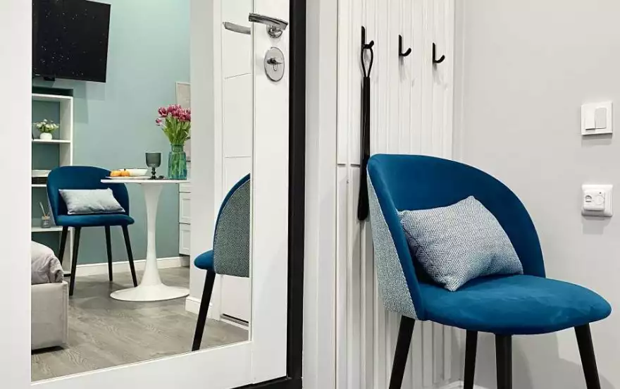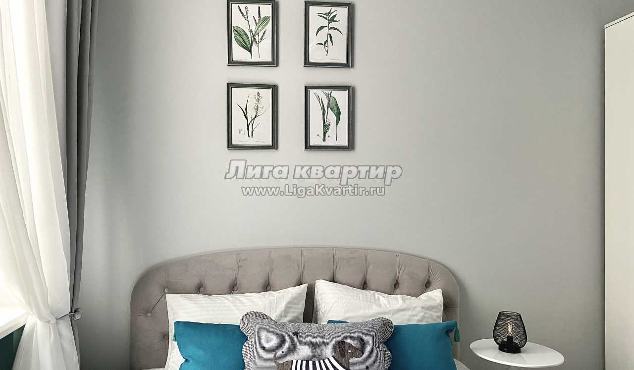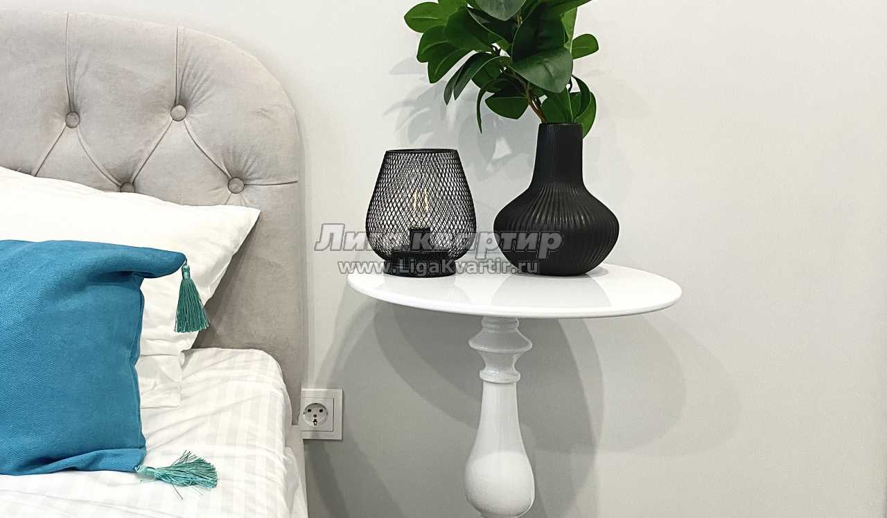 Квартира площадью 16 м² оформлена в современном дизайнерском стиле с продуманной планировкой. В спальной зоне — удобная двуспальная кровать с качественным матрасом, мягким текстилем и аккуратным декором. Интерьер выполнен в светлых оттенках с акцентами, создающими уютную и спокойную атмосферу.