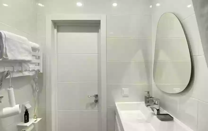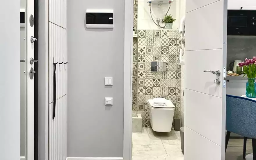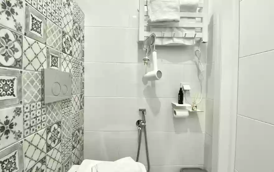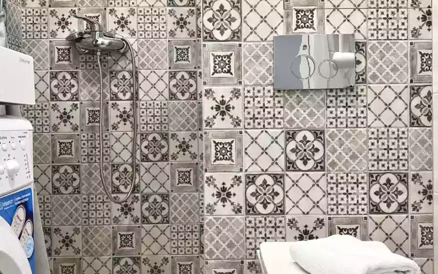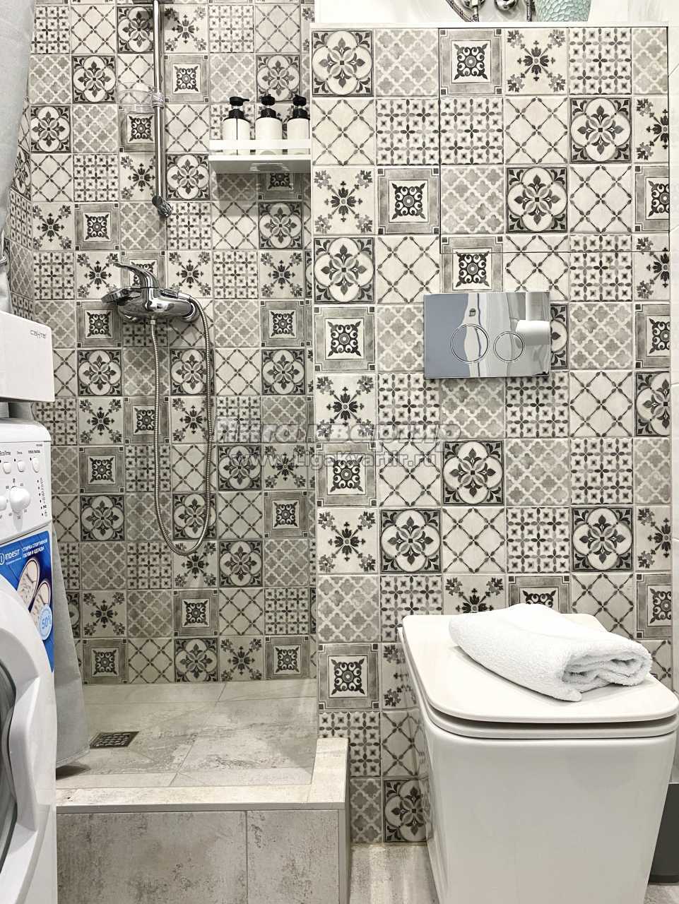 Санузел совмещённый, оснащён душевой зоной, стиральной машиной, раковиной и современными сантехническими решениями.
