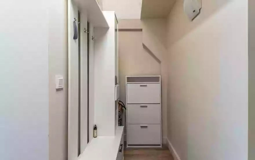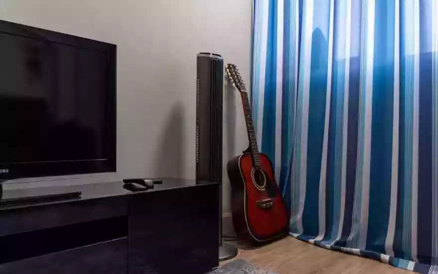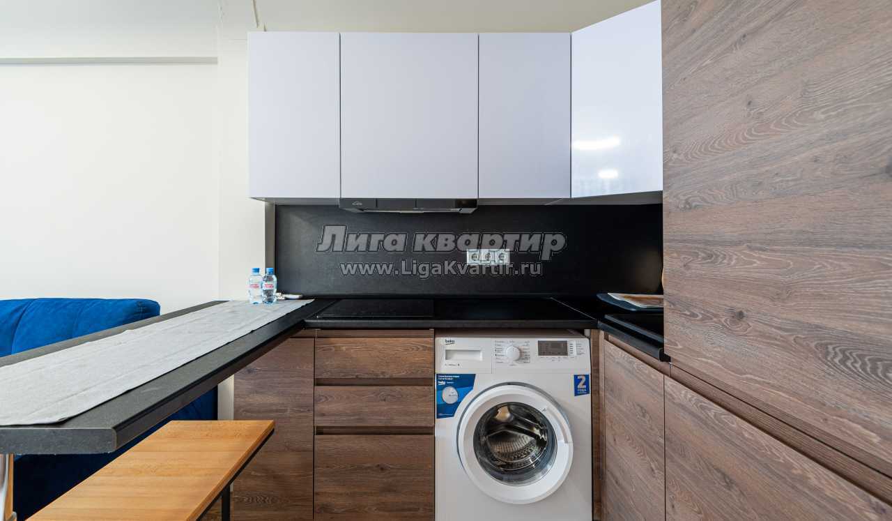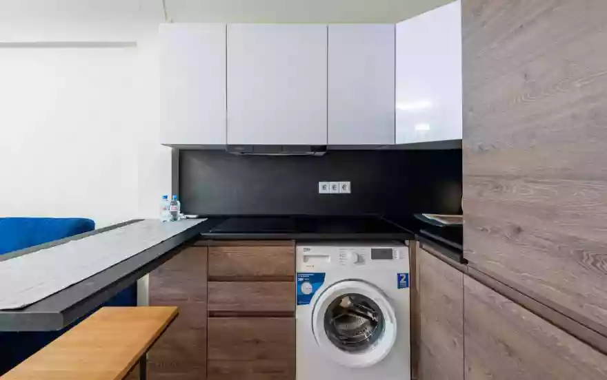 Интерьер выполнен в спокойных тонах с функциональной планировкой. В жилой зоне установлен удобный раскладной диван и телевизор. Кухонная часть оборудована варочной панелью, вытяжкой, холодильником и стиральной машиной, есть необходимая посуда и базовое оснащение для приготовления еды. Санузел совмещённый, с ванной и душевой системой.