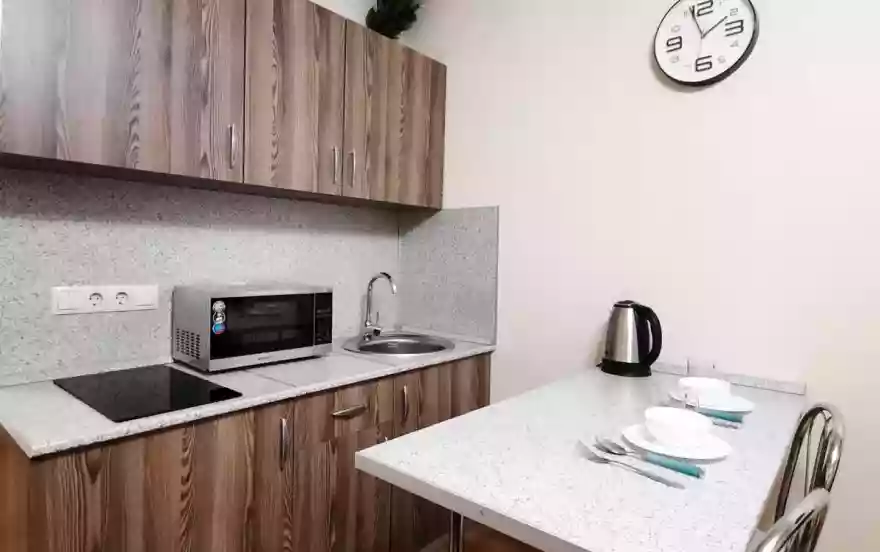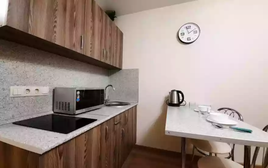 ТВ смарт, Wi-Fi интернет, цифровые каналы, стиральная машина, есть все необходимое для приготовления пищи, микроволновая печь, сенсорная плита, чайник, посуда. Бесплатные маршрутки до метро каждые 20 минут. На 4м и 1м этаже есть кафе-столовая.