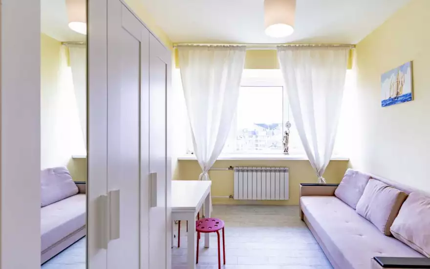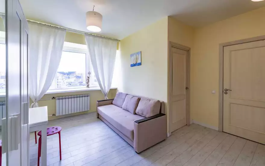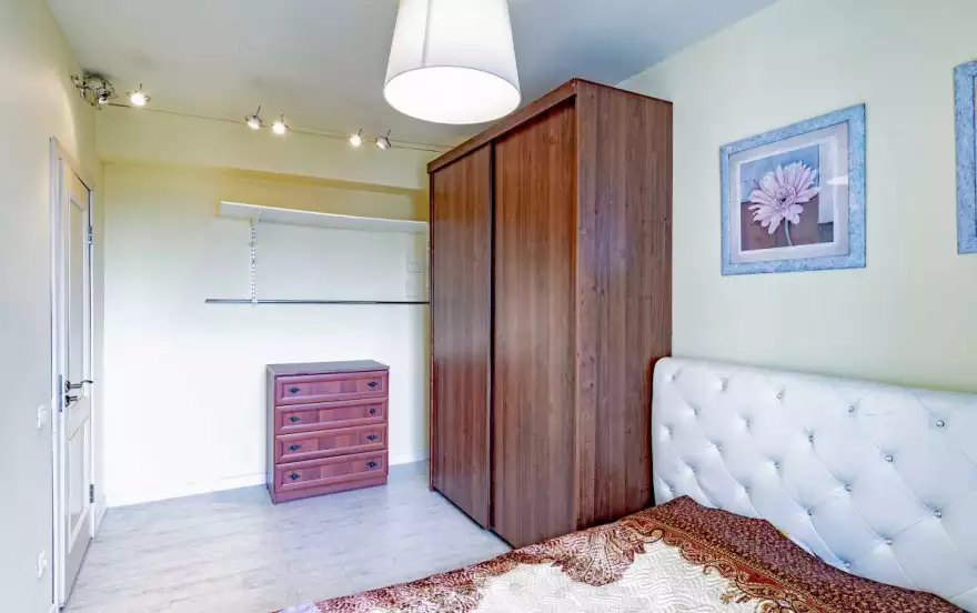 В квартире из мебели представлены две двуспальные кровати+двуспальный диван, шкаф. Предоставляется постельное белье, посуда, гладильная доска, утюг, бесплатный интернет. Курение и вечеринки запрещены.