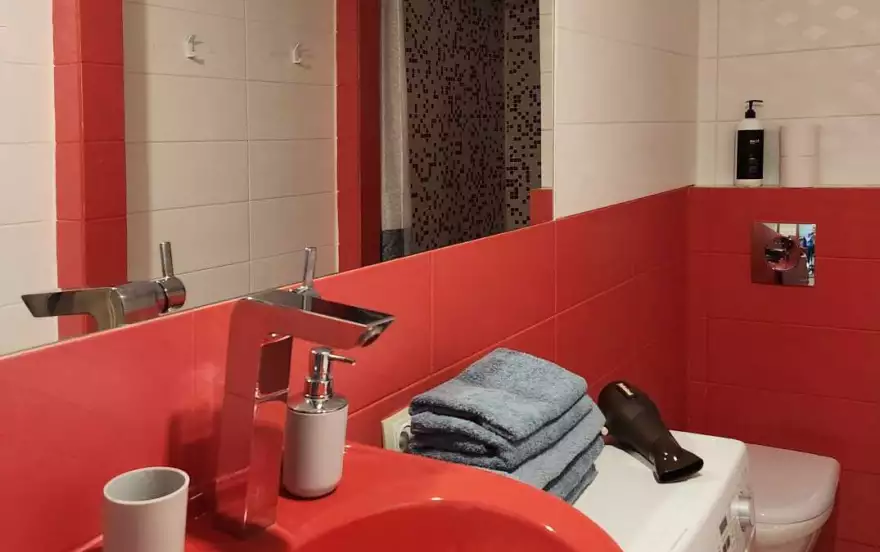 В квартире есть двуспальная кровать и раскладной диван, техника (фен, ЖК телевизор, стиральная машина, Wi-Fi, холодильник, плита, СВЧ-печь, электрический чайник, водонагреватель) и все для комфорта (постельное белье, полотенце, средства гигиены)