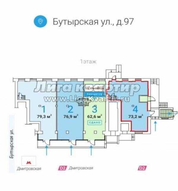 Лот №374143 Предложение от Собственника! Предлагается в аренду помещение свободного назначения 73.2 кв.м. на улице Бутырская. Объект расположен на первом этаже, в непосредственной близости от платформы МЦД и станции метро "Дмитровская" - менее 1 минуты пешком. Интенсивный пешеходный поток. Развитая инфраструктура, крупный жилой район. Входная группа в помещение с фасада, а также есть зона разгрузки (отдельный вход). Высота потолков 1-го этажа - 3,3 м. Железобетонные перекрытия. Отлично подойдёт в аренду под любой вид деятельности - торговое помещение, магазин, аптека, салон красоты, офис продаж, медицинский центр, кофейня и прочее.