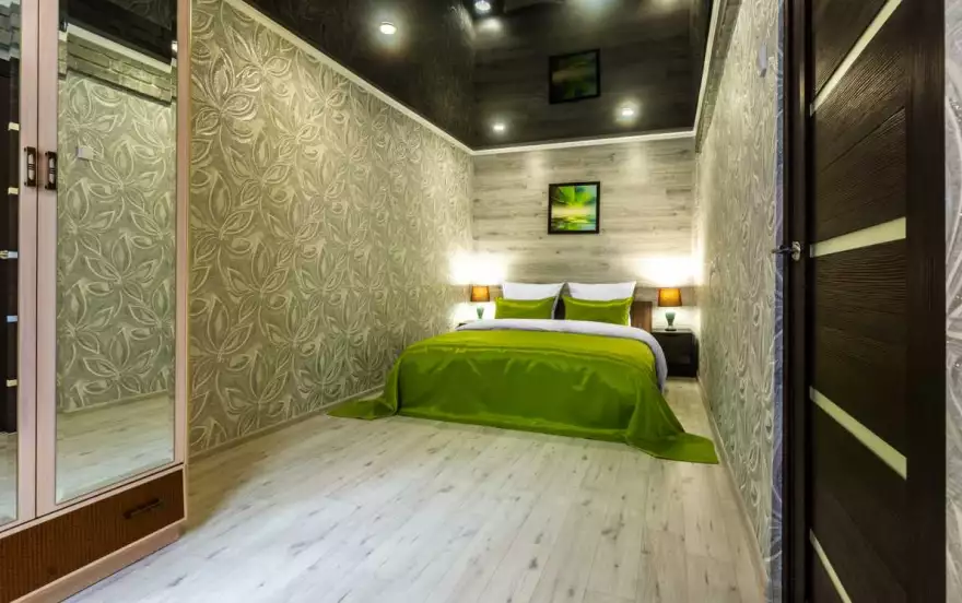 ✔ В стильной спальне с красивым тонированным потолком, двуспальная кровать с ортопедическим матрасом способствует качественному отдыху и сну. Для полной светоизоляции предусмотрены плотные портьеры. Личные вещи можно разместить в большом зеркальном шкафу. Светильники на прикроватных тумбах дополнят ощущение истинного домашнего уюта и комфорта.