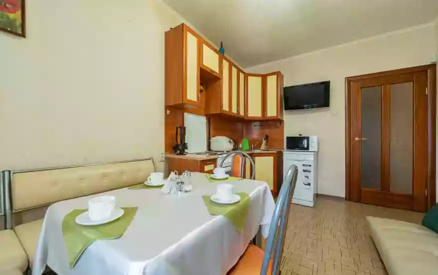 ✔ Большая кухня-столовая с современным гарнитуром оснащена всей необходимой бытовой техникой и полным комплектом разнообразной посуды на шесть персон гостей. Для отдыха предусмотрен третий ЖК-телевизор. Уютная обеденная зона представляет собой мягкий уголок, гарантирующий каждому гостю приятную трапезу и душевное чаепитие. Для абсолютного комфорта предоставлен мягкий диван из эко-кожи, который легко раскладывается и может послужить дополнительным спальным местом. В наличии посудомоечная машина, которая избавит гостей от лишних бытовых хлопот.