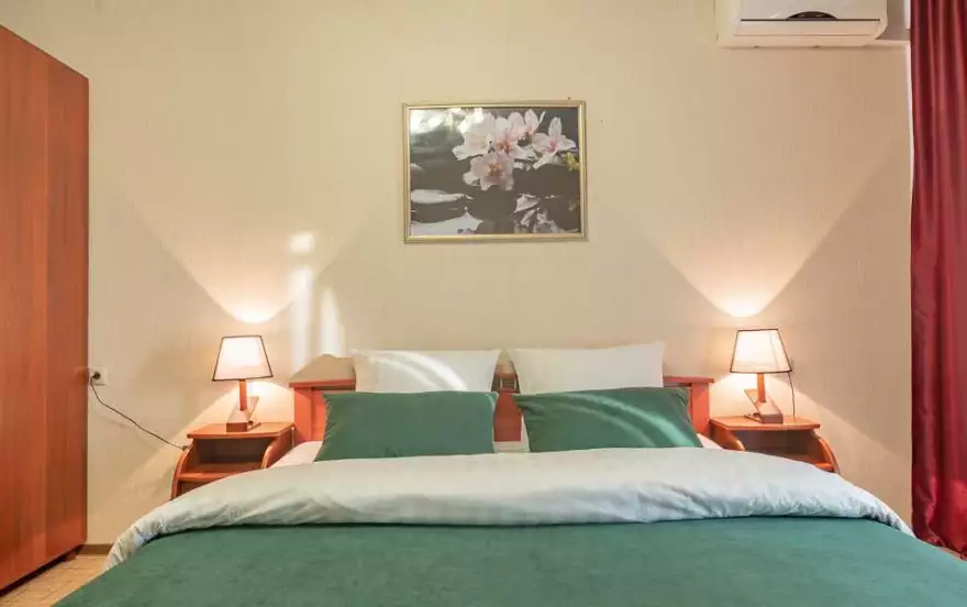 ✔ В просторной гостиной, создающей атмосферу бодрости и позитива, размещена качественная двуспальная кровать с ортопедическим матрасом и удобный угловой диван, легко преобразующийся в полноценное двуспальное место. Проведение досуга обеспечит большой ЖК-телевизор и высокоскоростной Wi-Fi. Разместить вещи можно в шкафу-стенке и комоде. Прекрасным дополнением интерьера гостиной служит журнальный стол и плотные портьеры.