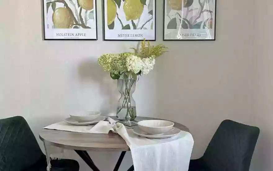 Полностью укомплектованная кухня - холодильник, электрический чайник, микроволновка, полноценная электрическая плита, духовка, обеденный стол со стульями, посудомоечная машина.