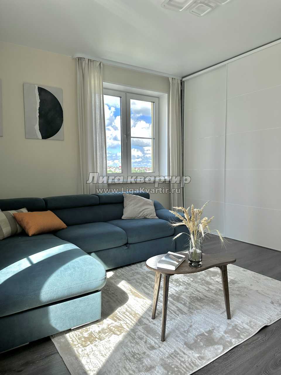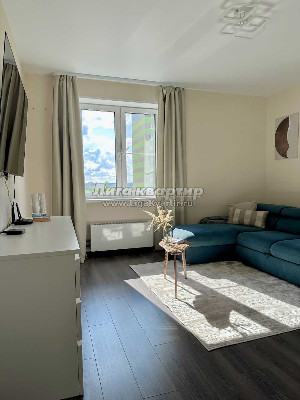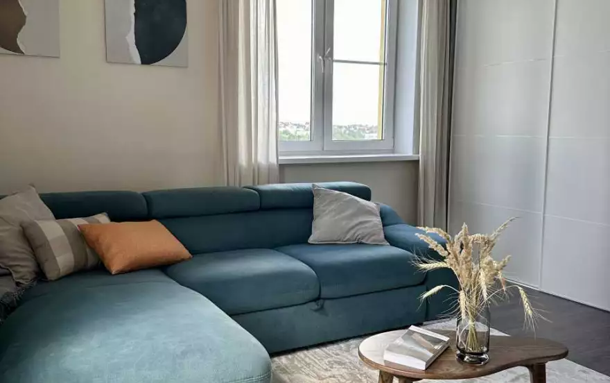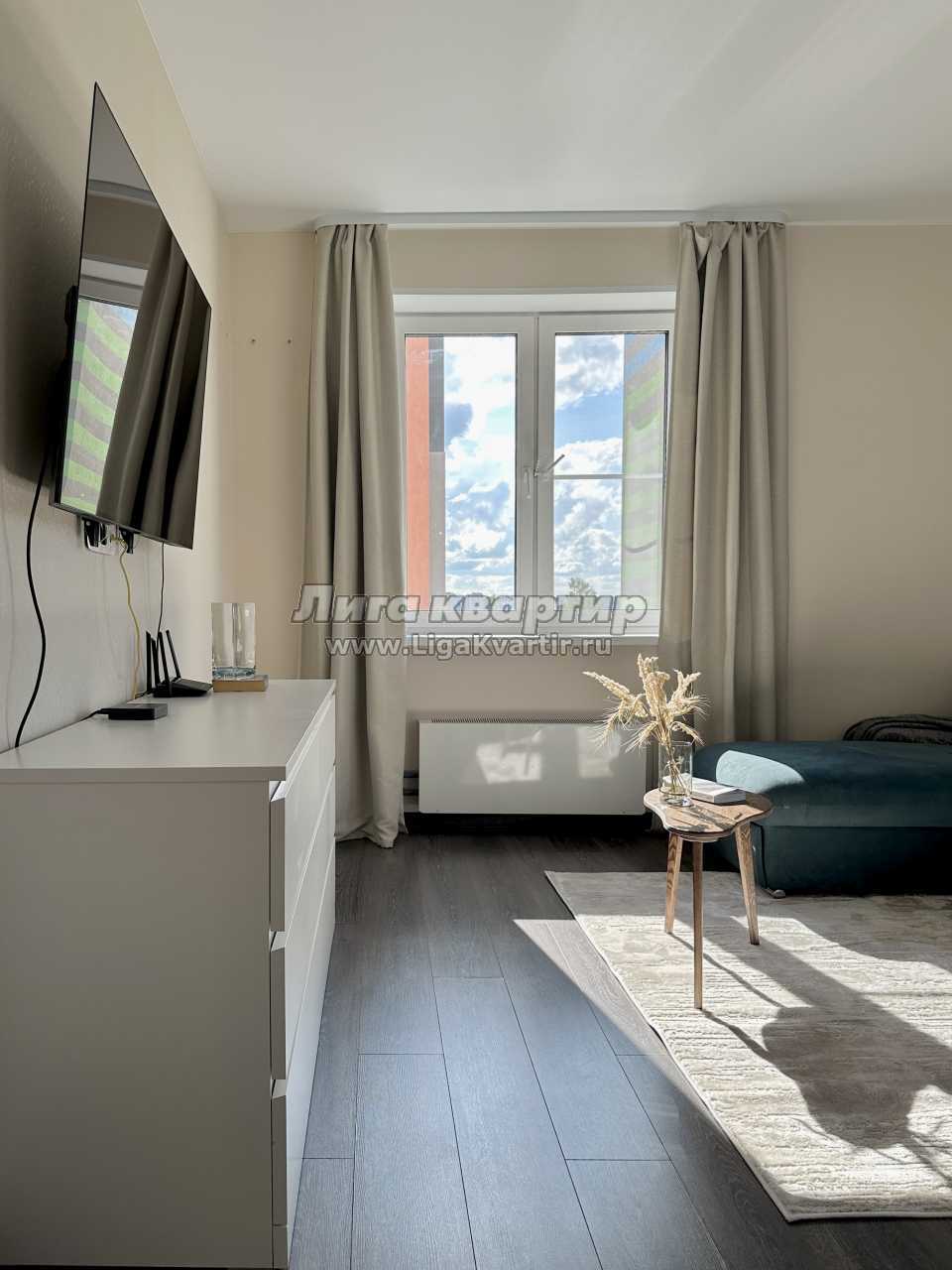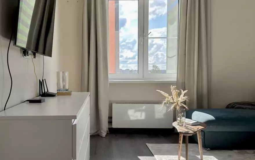 В зале находится удобный раскладной двуспальный диван, телевизор c приставкой IPTV, шкаф для вещей, кофейный стол, пылесос.