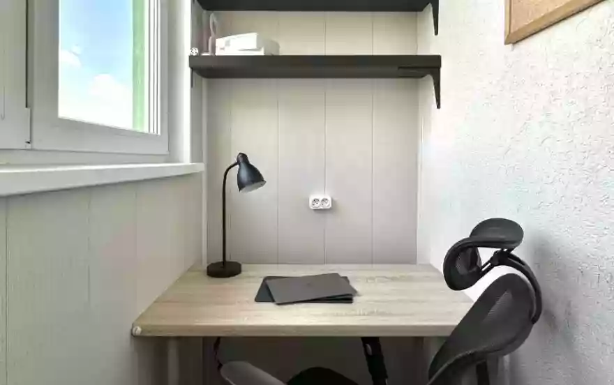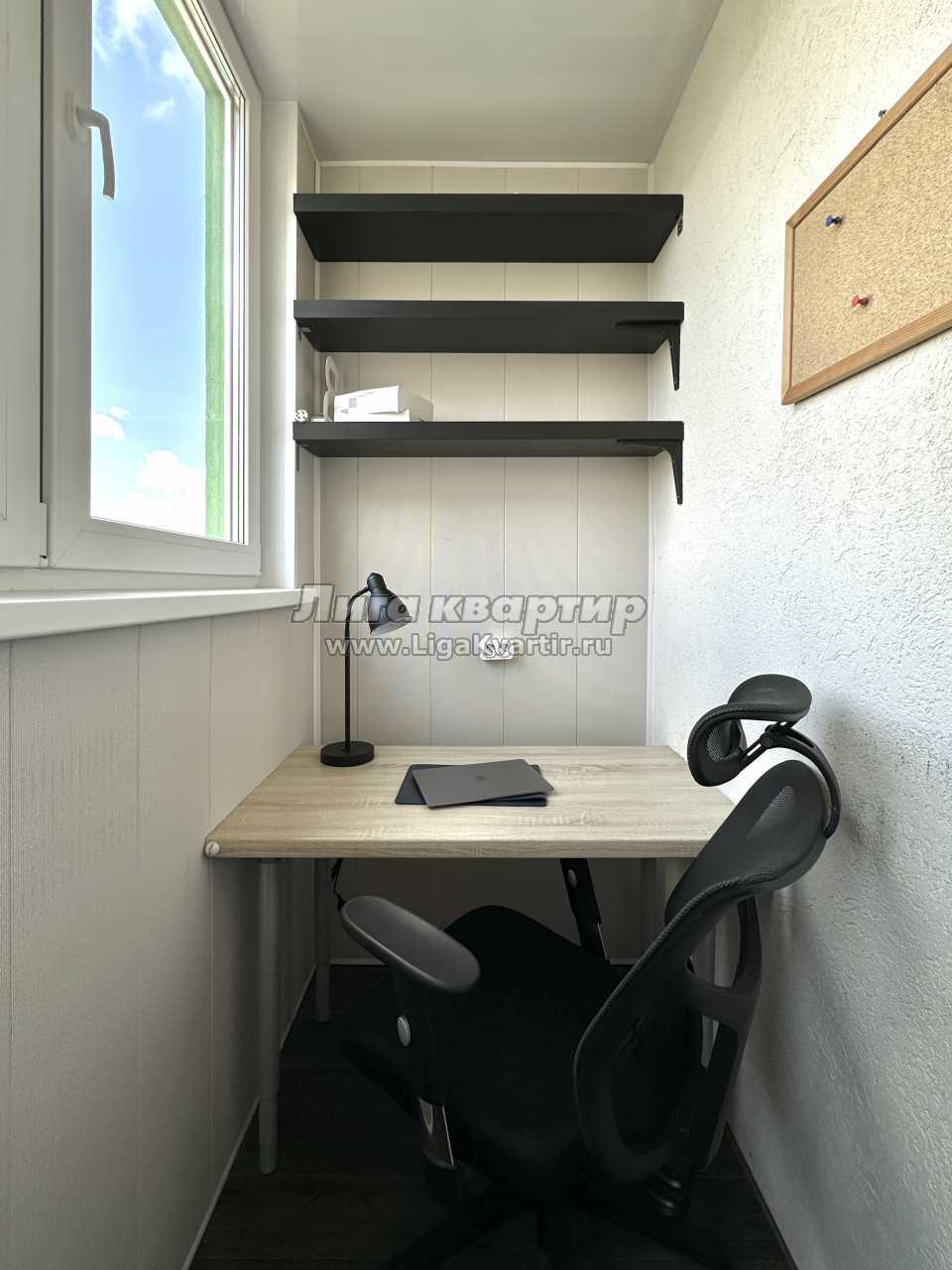 На балконе находится полноценное рабочее место с удобным офисным креслом.
