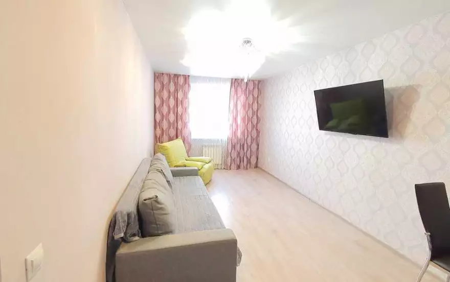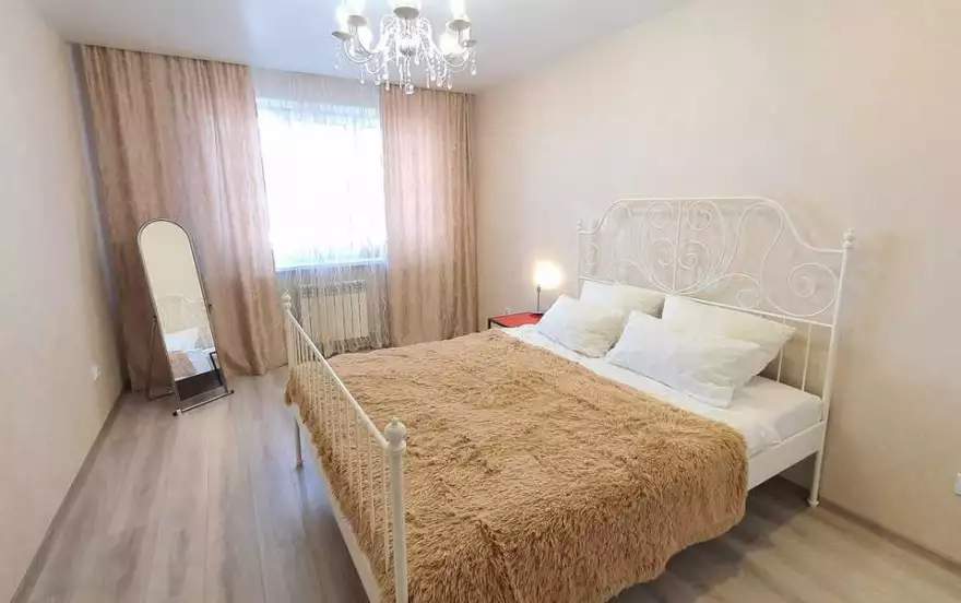 Квартира с комфортной мягкой мебелью, спальные места представлены двухспальной кроватью, диваном-кроватью и раскладным креслом, которые смогут свободно разместить 5 гостей.