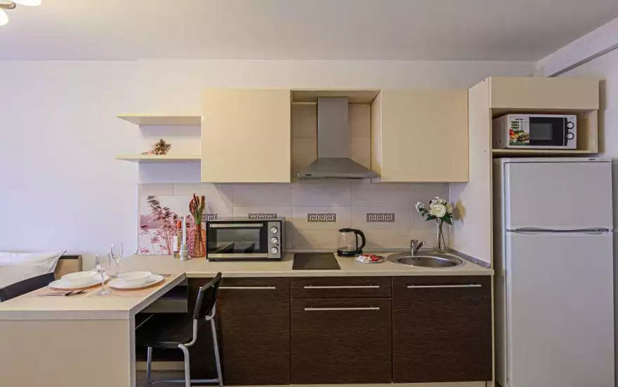 Кухня оборудована всей необходимой бытовой техникой и посудой. Чай, сахар, даже конфетки уже готовы к вашему приезду. Есть гардеробная.