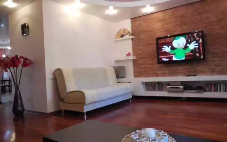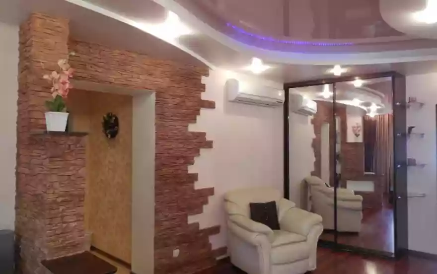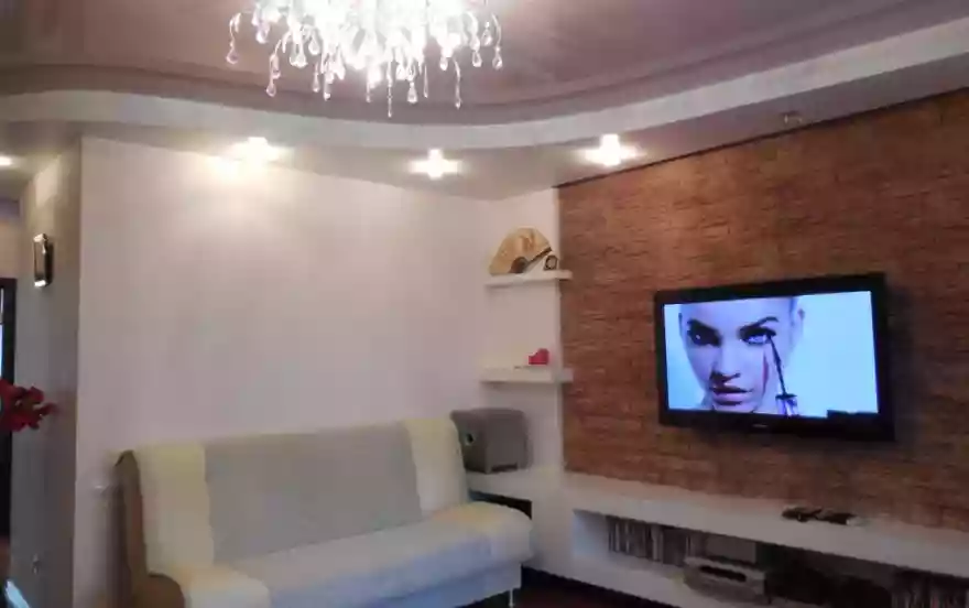 Высококачественный дизайнерский современный ЕВРО ремонт, эксклюзивное цветовое решение отделки придают квартире уют и комфорт: натяжные двухуровневые потолки во всей квартире, паркетная доска, водонагреватель (всегда есть горячая вода!), два кондиционера, 4 ЖК-TV с кабельными каналами, камин, джакузи, входная стальная дверь, домофон, два двуспальных дивана + двуспальная большая кровать, шкафы — купе, встроенный кухонный гарнитур, плита стеклокерамика, большой холодильник, СВЧ, электрочайник, пылесос, утюг, гладильная доска, сушилка для белья, фен, стиральная машина автомат + стиральный порошок, бесплатный WIFI интернет, вся посуда, обеденный большой стол, глаженное красивое постельное белье и полотенца, шампунь и гель для душа, чай и кофе, тапочки. Фотографии квартиры соответствуют!