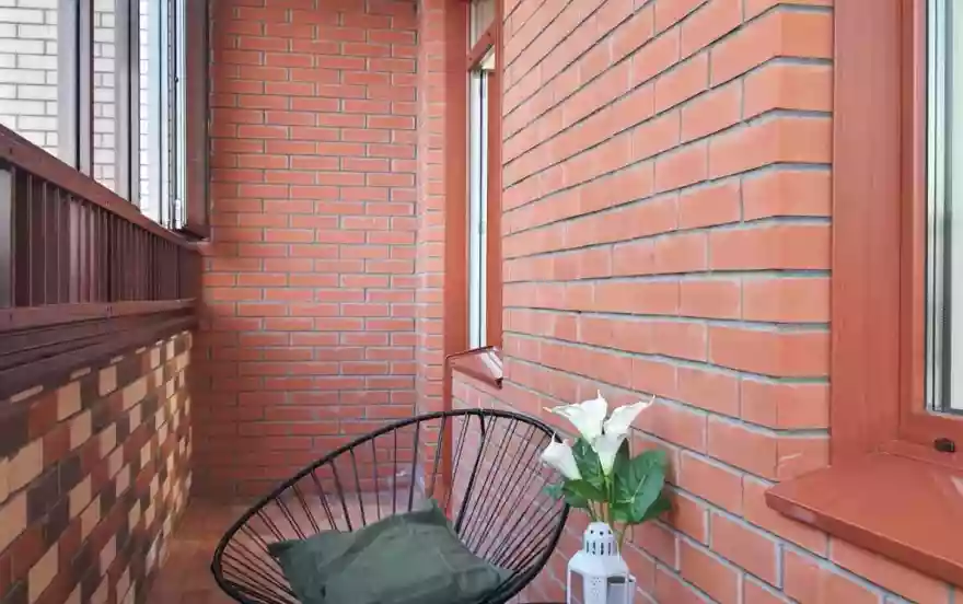 Просторная лоджия с двумя выходами в апартаменты (из кухни-гостиной и спальни) с шикарным панорамным видом на город с 21 этажа.