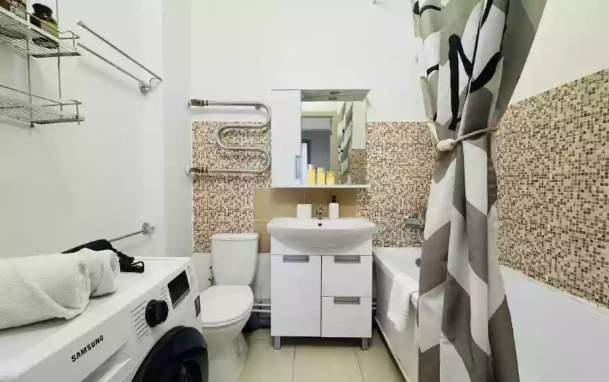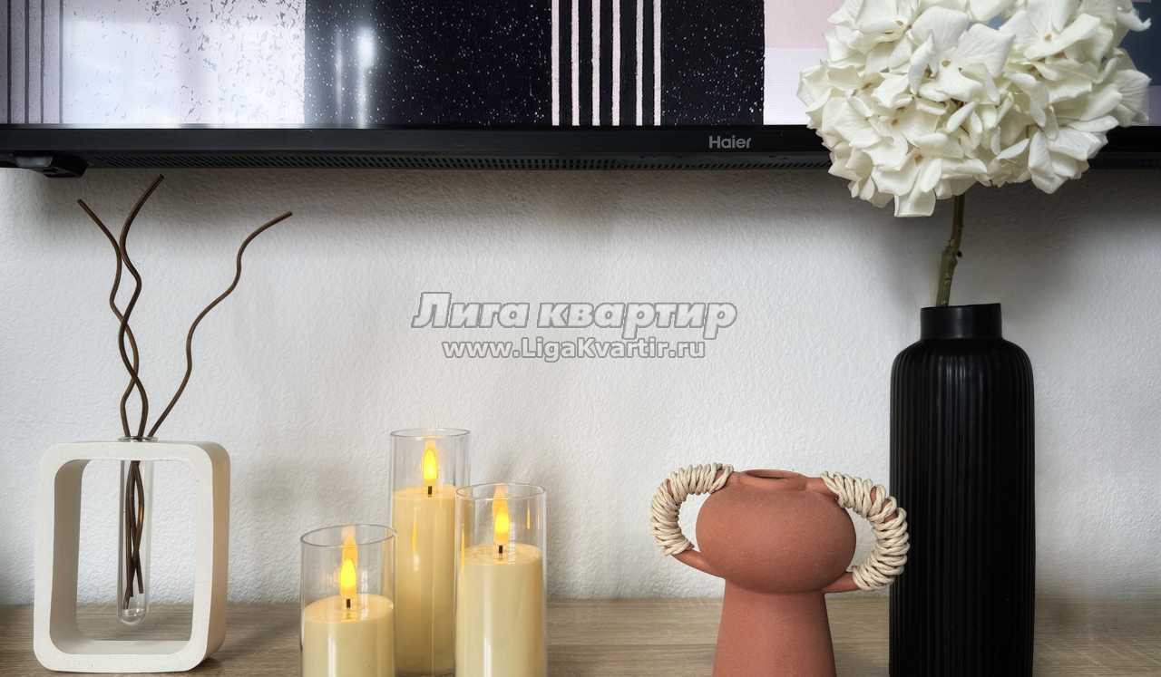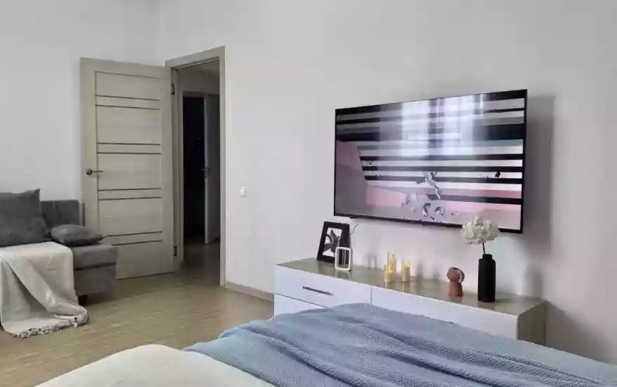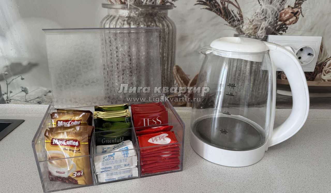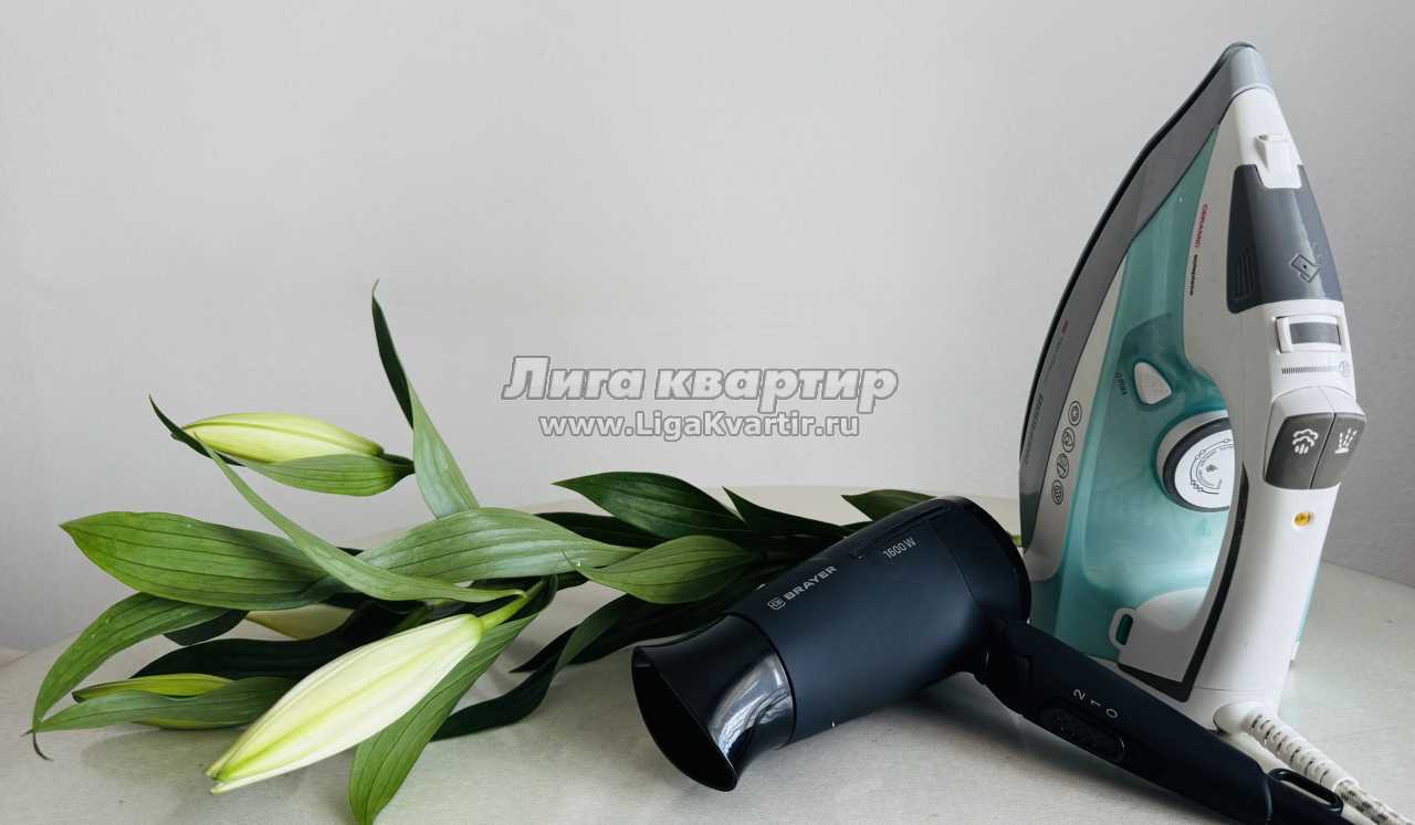 * техника: Smart-TV 55 дюймов, безлимитный Wi-Fi, холодильник, СВЧ, варочная панель, электрический чайник, стиральная машина, водонагреватель, фен, утюг, вентилятор
