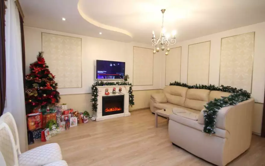 Гостиная: Просторная с кожаным угловым диваном, большим ЖК-телевизором, музыкальной акустикой и искусственным камином для создания домашнего уюта.