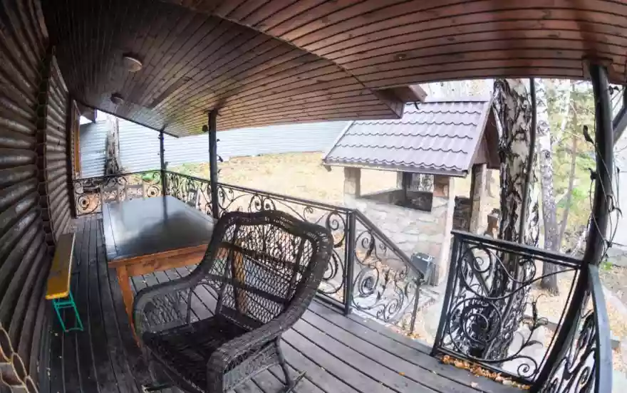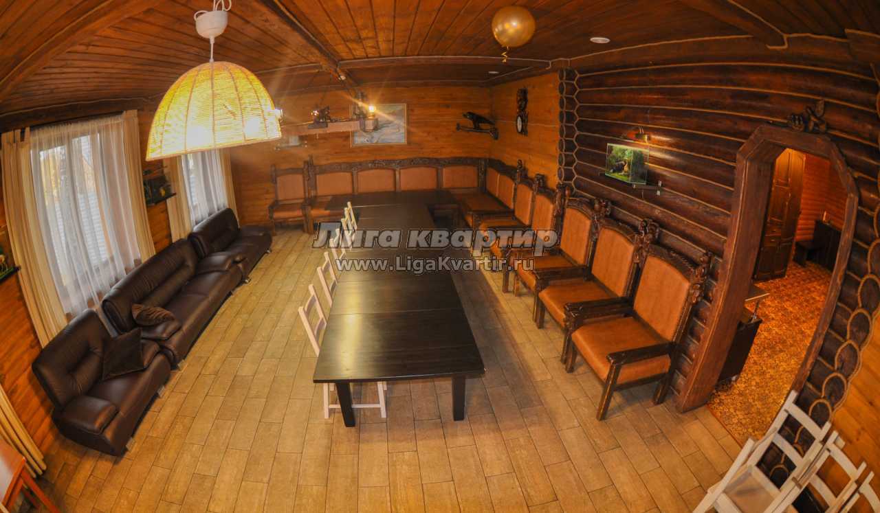 Коттедж создан в охотничьем стиле, что создает особое настроение. Расположен в березовой роще, недалеко от озера.