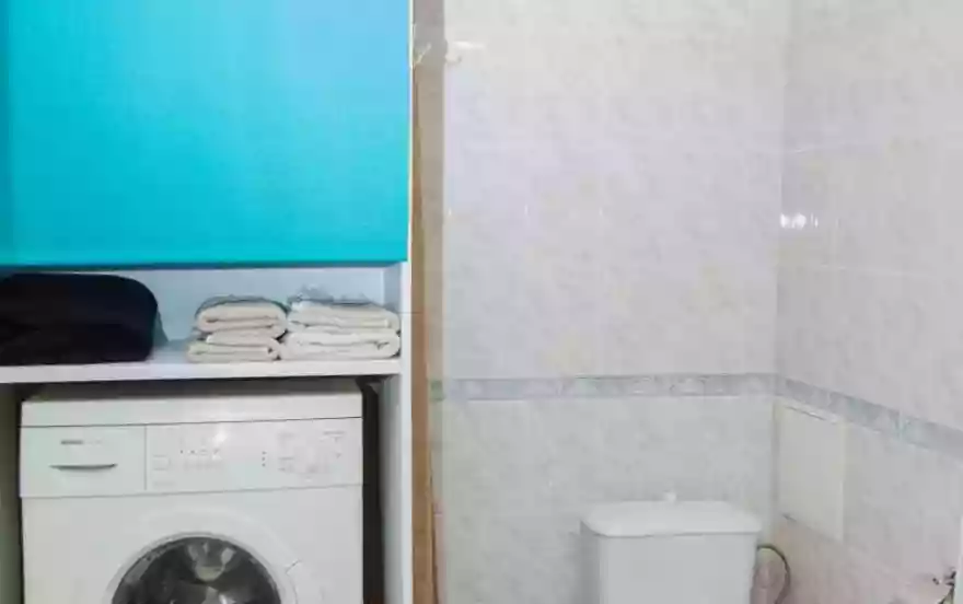 • техника: Большой телевизор, стиральная машина, плита (газ), микроволновая печь, холодильник, электрочайник, фен, утюг (вентилятор и обогреватель по запросу).