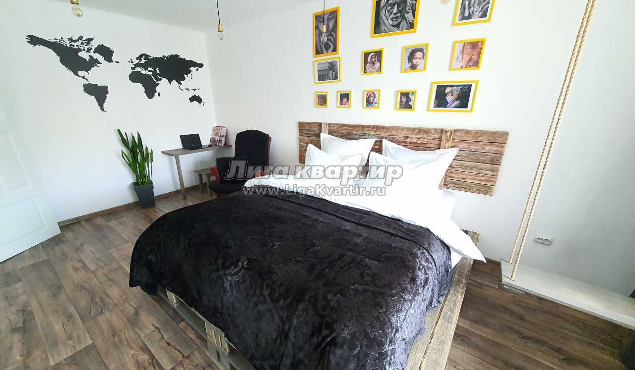 - Изюминка квартиры — большая, дизайнерская кровать на подиуме из т. н. поддонов (поддоны сделаны из массива дерева в нашей мастерской. Вся конструкция тщательно собрана и закреплена, нигде ничего не скрипит)
