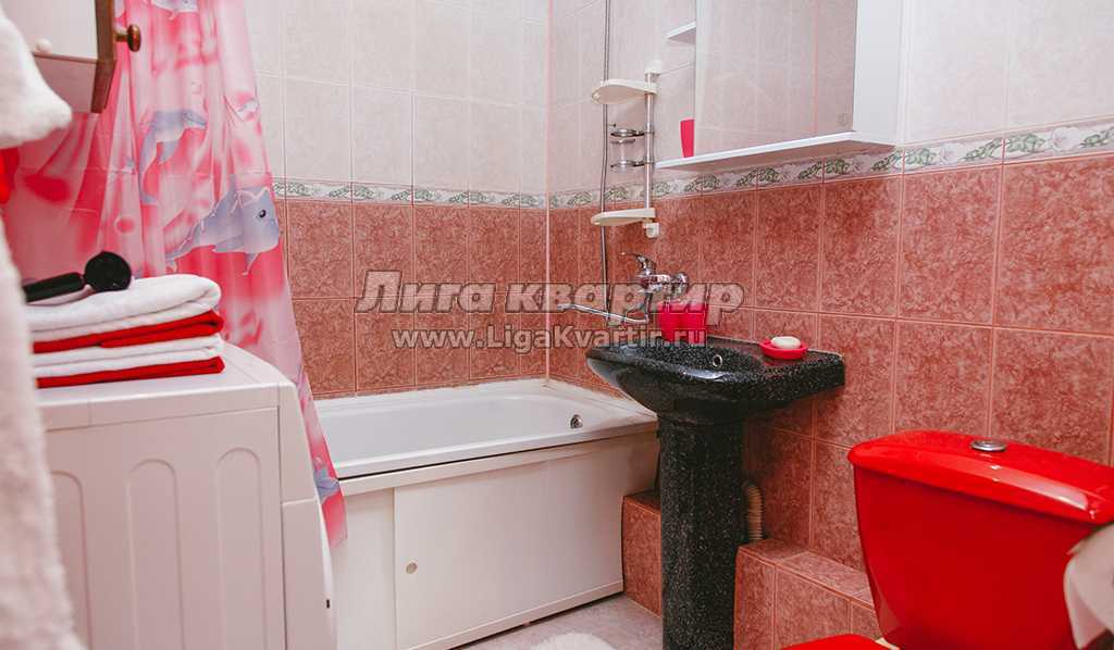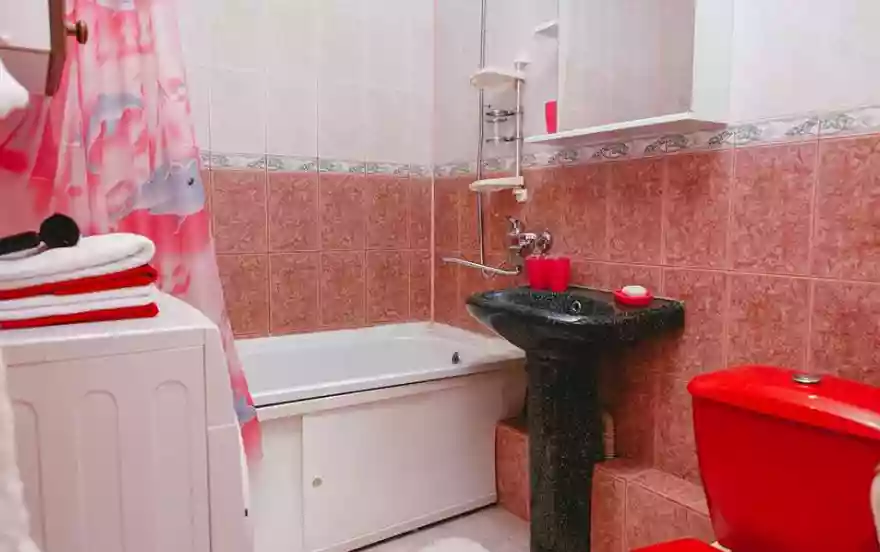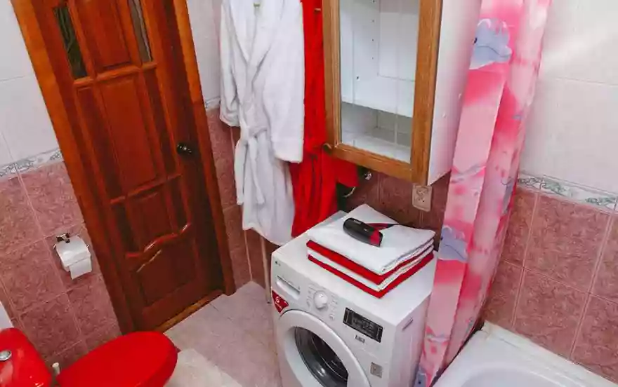 - Ванная комната оборудована оригинальной стильной сантехникой. Есть стиральная машина-автомат и все принадлежности для полноценного ухода за собой и релаксации.