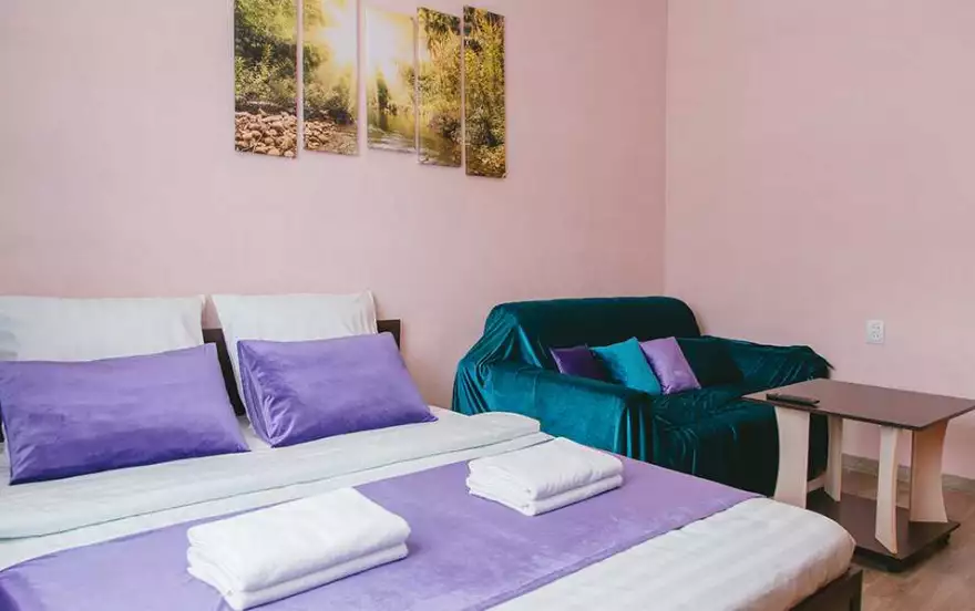 - В комнате имеется двуспальная кровать с ортопедическим матрасом и раскладной диван. Для хранения вещей предназначен шкаф-стенка. Установлен большой ЖК-телевизор. Для удобства гостей есть журнальный стол.