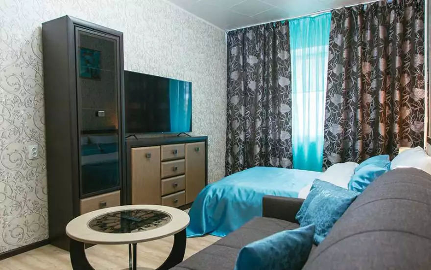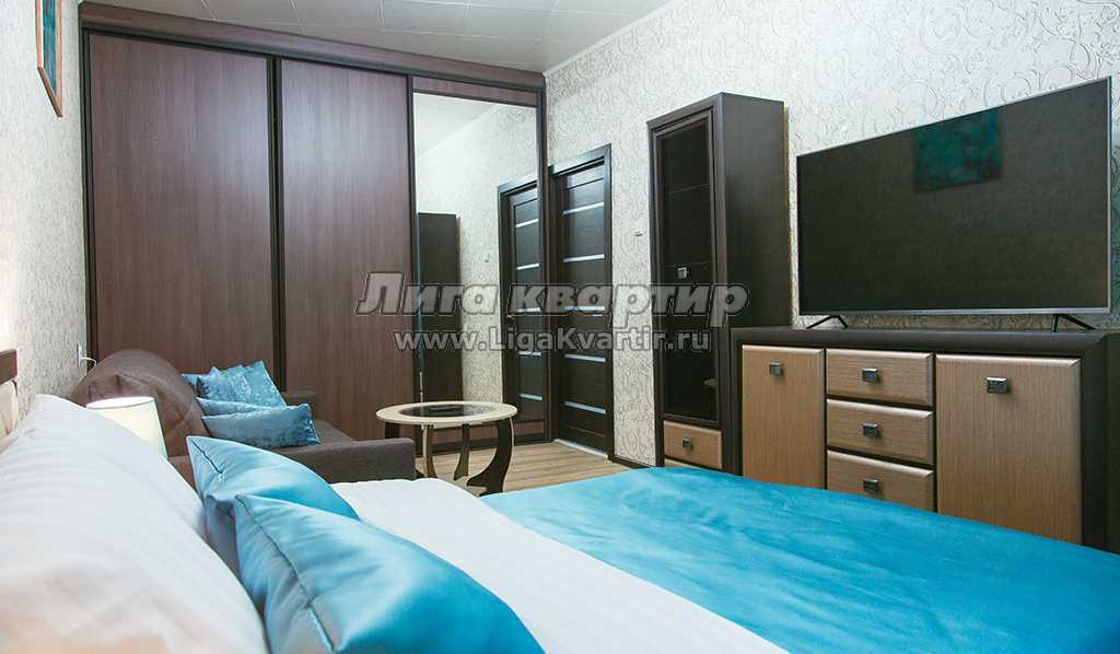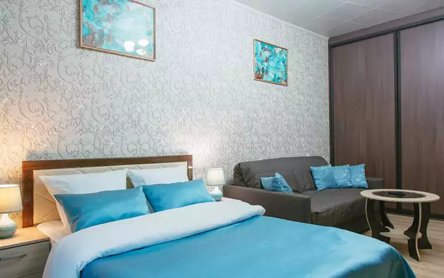 ✔ В комнате с современным интерьером двуспальная кровать с ортопедическим матрасом обеспечит прекрасный сон на свежем белоснежном выглаженном белье. Второе полноценное двуспальное место гарантирует комфортный, при необходимости легко раскладывающийся, диван. Для досуга предусмотрен красивый журнальный столик, Wi-Fi и большой ЖК-телевизор. Прикроватные тумбы со светильниками создают атмосферу абсолютного домашнего уюта. Размещению вещей послужит компактная TV-стенка и встроенный вместительный шкаф-купе с зеркальной створкой, создающий эффект увеличения пространства.