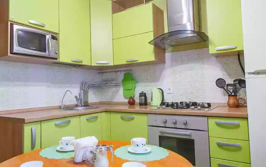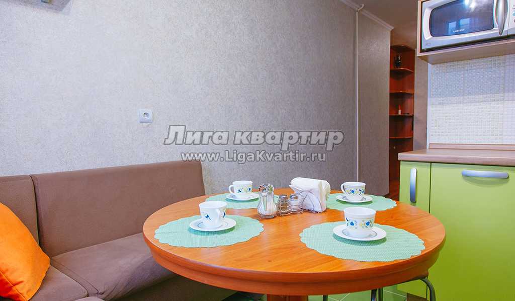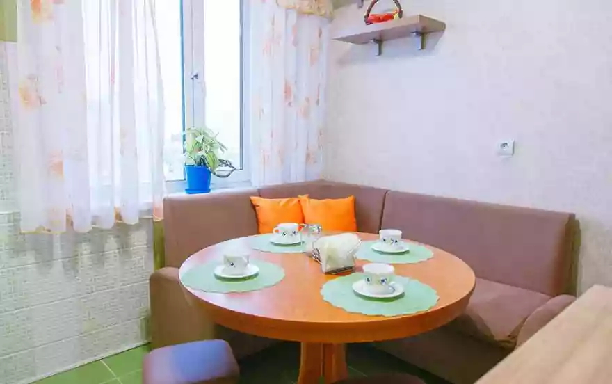 ✔ Достаточно просторная кухня оборудована красивым колоритным гарнитуром. Присутствует вся мебель и техника для полноценного длительного проживания гостей квартиры. Есть уютная обеденная зона с круглым столом и замечательным угловым диванчиком. Присутствие полного комплекта посуды на шесть персон позволит готовить привычный домашний рацион на любой вкус.