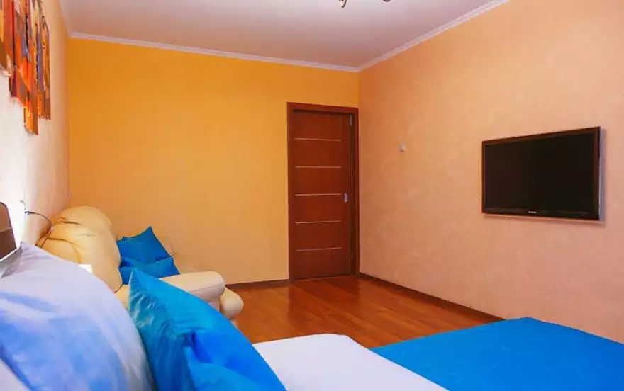 ✔ В гостиной мягкий диван из эко-кожи, который легко трансформируется в удобное двуспальное место. Есть большой ЖК-телевизор, журнальный стол. Здесь же вторая двуспальная кровать с ортопедическим матрасом, прикроватной тумбой и светильником. В наличии книжная полка, для гостей, которые хотят разнообразить досуговое время.