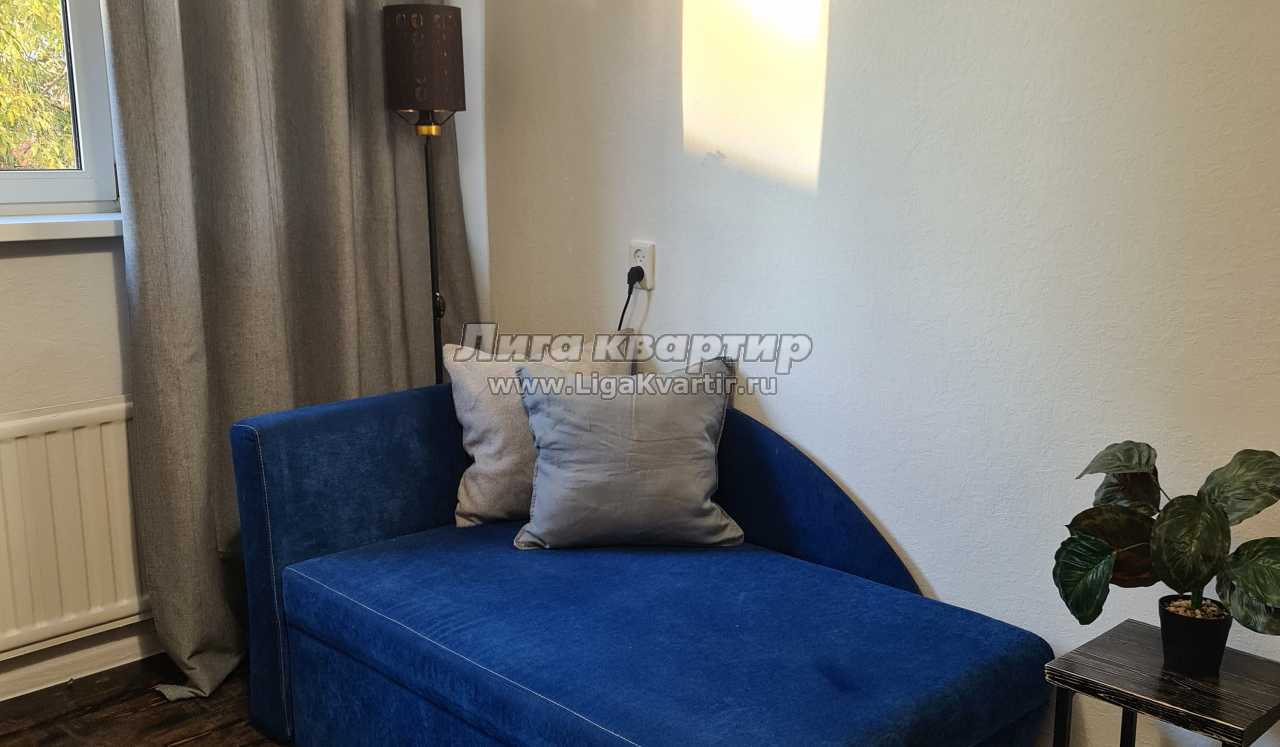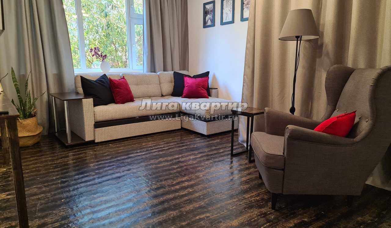 - В гостиной большой угловой раскладной диван, трансформирующийся в полноценное двуспальное место. Также зонирована ниша с двуспальной откидной кроватью (кровать очень удобная с ортопедическим матрсом), которая легко складывается и раскладывается. Большая плазменная панель и уютное кресло с торшером дополняют уголок отдыха.