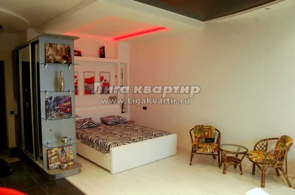 Пространство квартиры разделено на зону отдыха с двуспальной кроватью и кухонную зону с диваном, на котором может поместиться 1 человек. Таким образом, здесь могут разместиться до 3 человек.