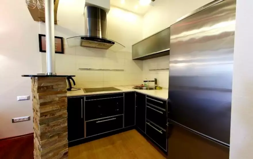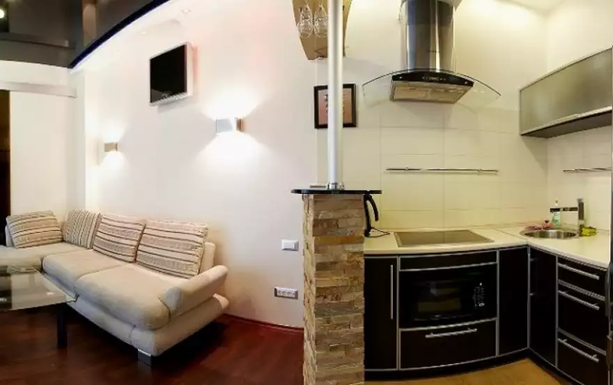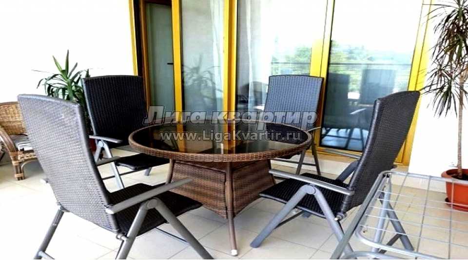 Квартира, с дизайнерским ремонтом, состоит из спальни с двуспальной кроватью, кухни-гостиной с раскладным двуспальным диваном, прихожей, санузла, и террасы с ротанговой мебелью для отдыха. В квартире 4 спальных места.